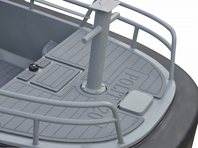 La Pilot 420 è equipaggiata con due bitte da traino, una a prua e una a poppa, direttamente collegate alla struttura dell’imbarcazione. Dispone inoltre di una console di guida, un sedile bolster confortevole con doppio vano portaoggetti, quattro bitte d’ormeggio (due a prua e due a poppa), rivestimento antiscivolo in EVA, due ampi gavoni anteriori, un serbatoio da 60 litri, un’ampia piattaforma di lavoro a prua e un gavone per ancora.