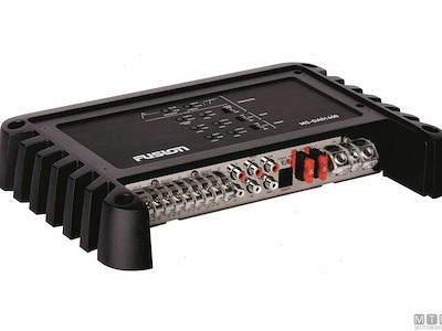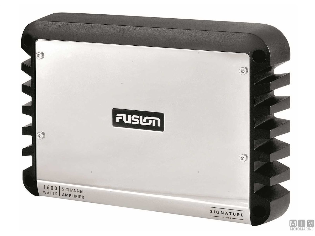 Amplificatore marino Fusion SG-DA51600 a cinque canali in classe D. Pannello frontale in acciaio inox con dissipatori in alluminio. Dotato di crossover variabili e protezione contro i picchi di tensione.
