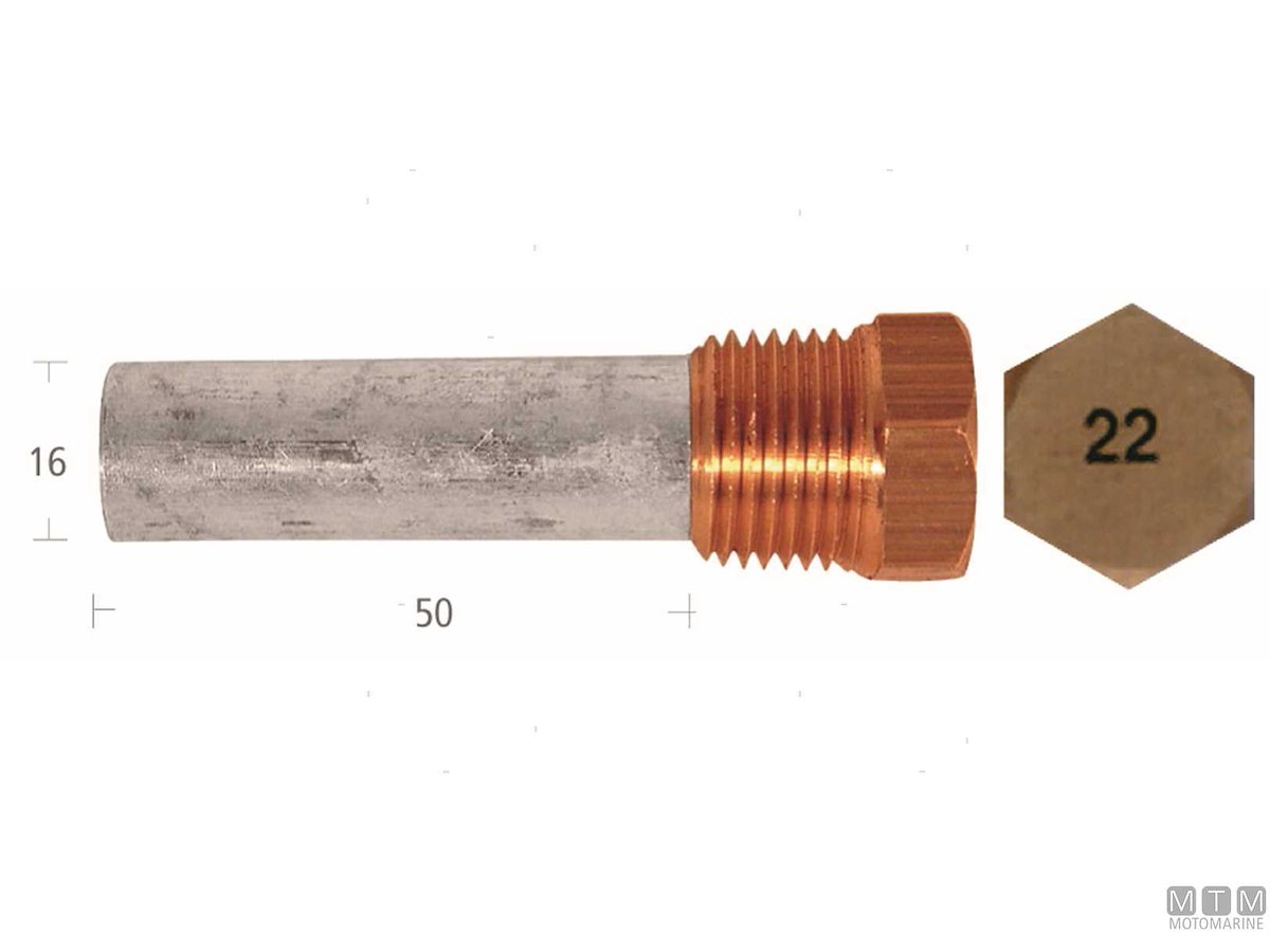 Anodo barrotto per motori Yanmar 4LH(new) / 6LP / 6LY2 / 6LY. Cod.: 5127578 Codice originale: 119574-18790 Materiale: Zinco kg: 0,13 a ("): 1/2 l (mm): 50 c (mm): 22 Ø (mm): 16