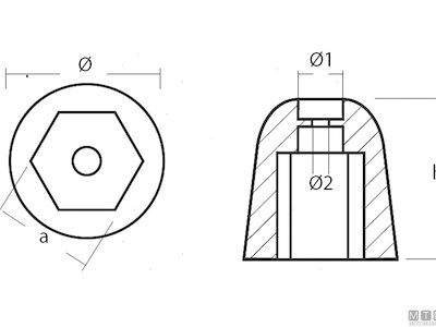 Anodo a ogiva a esagono incassato per bow thruster Vetus. Cod.: 5165518 Codice originale: BP195 Materiale: Zinco kg: 0,39 a (mm): 28 h (mm): 47 Ø (mm): 53 Ø1 (mm): 11 Ø2 (mm): 7