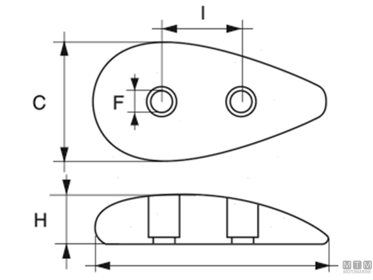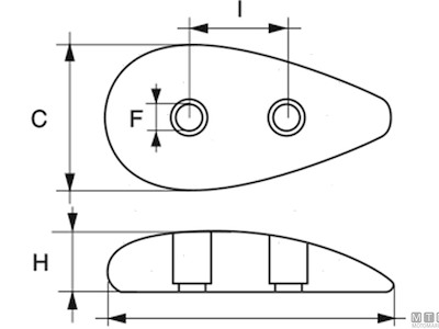 Anodo piastra a goccia per carene. Cod.: 5110101 Materiale: Zinco kg: 0,30 A (mm): 85 C (mm): 45 I (mm): 33 F (mm): 7 H (mm): 20