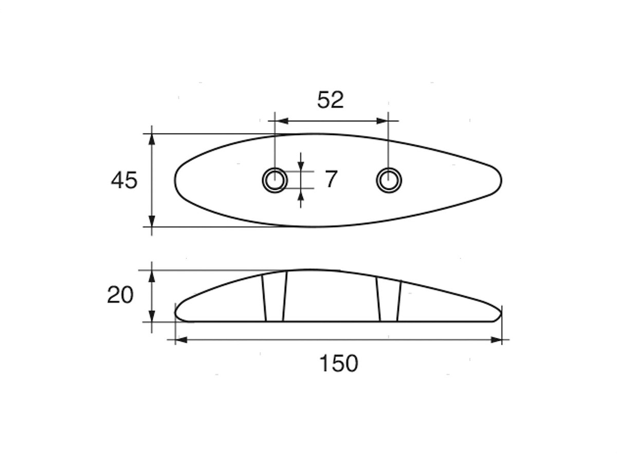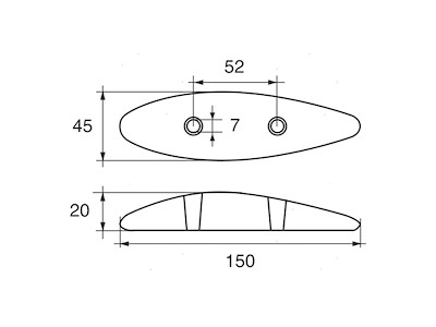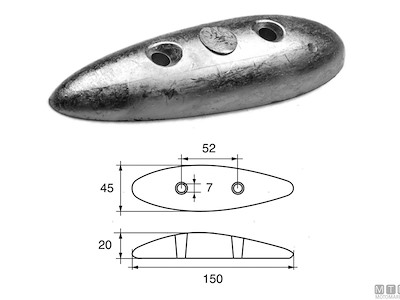Anodo piastra ovale per carene. Cod.: 5110102 Materiale: Zinco kg: 0,50 A (mm): 180 C (mm): 45 I (mm): 52 F (mm): 7 H (mm): 20