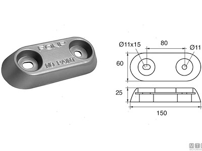 Anodo piastra per carene. Cod.: 5110901 Materiale: Zinco kg: 0,95 A (mm): 150 C (mm): 60 I (mm): 80 F (mm): 11x15 F1 (mm): 11 H (mm): 25