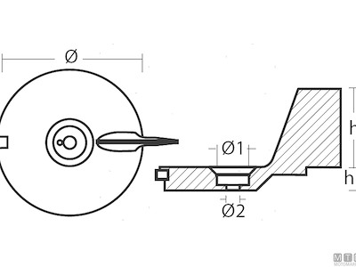 Anodo pinna per motori Mercury 18-25 HP (vecchio). Cod.: 5123304 Codice originale: 94286T Motore: 18-25 HP Materiale: Zinco kg: 0,26 h (mm): 52 h1 (mm): 14 Ø (mm): 95 Ø1 (mm): 22 Ø2 (mm): 9