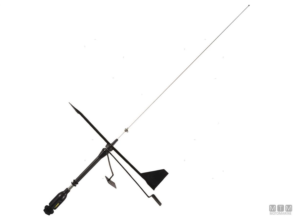 Antenna VHF Supergain Black Swan in Acciaio Inox con segnavento per barche a vela. 50W / 3db / 156/162 MHz / 50 Ohm. Altezza 0,80 m. Completa di cavo coassiale 20 m e base montaggio a staffa per testa d'albero.