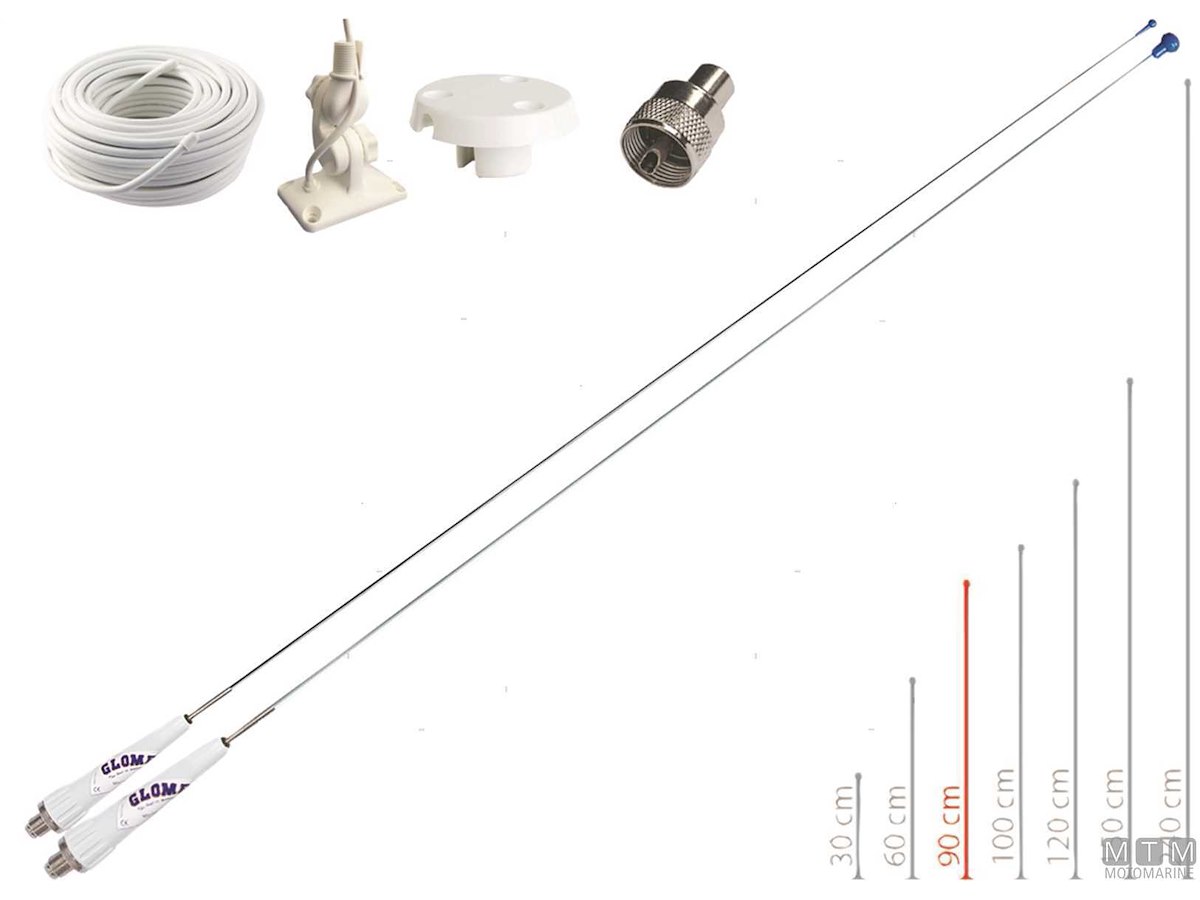 Antenne VHF RA106 in Vetroresina o in Acciaio Inox svitabili e stivabili per gommoni. 100W / 3db / 156/162 MHz / 50 Ohm. Altezza 0,9 m. Complete di connettore, cavo coassiale da 4,5 m, passacavo e base RA135.
