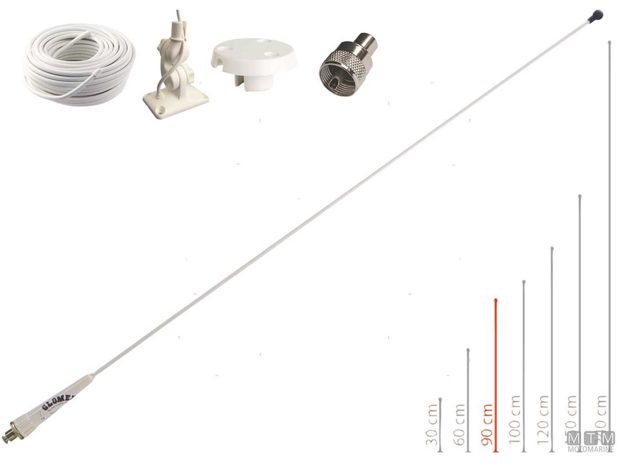 Antenna VHF RA106GRPPB6-135 in Vetroresina per barche a motore. 100W / 3db / 156/162 MHz / 50 Ohm. Altezza 0,9 m. Completa di connettore, cavo coassiale da 4,5 m, passacavo e base RA135.