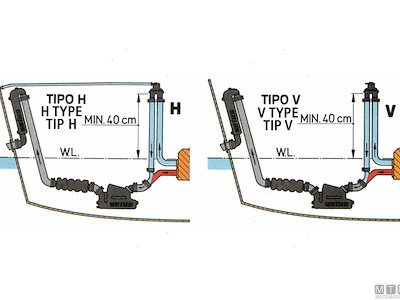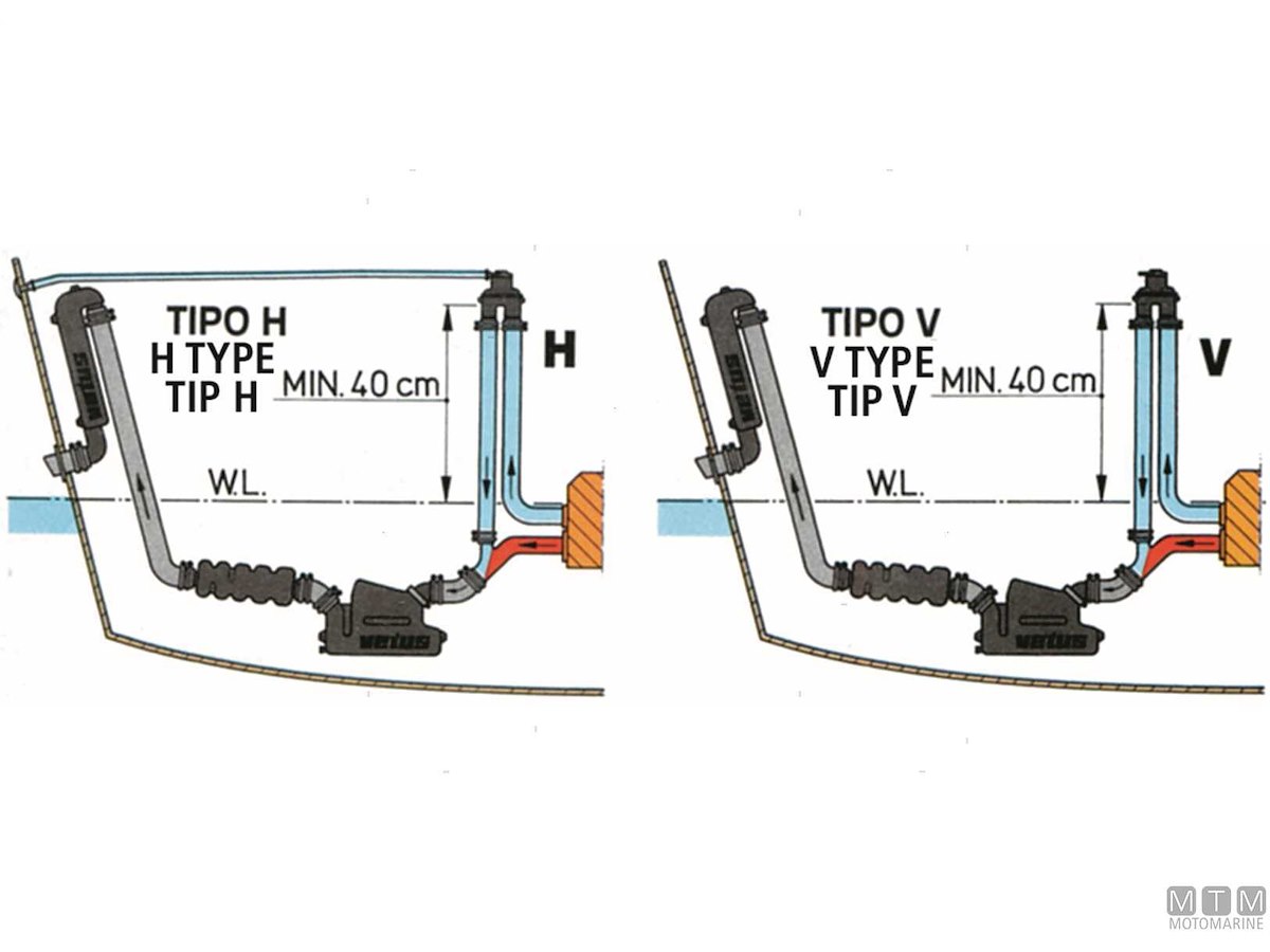 Antisifoni per impianti di scarico sotto la linea di galleggiamento.Se il livello dell'iniezione dell'acqua di raffreddamento nello scarico del motore si trova a meno di 15 cm sopra la linea di galleggiamento oppure sotto la stessa, quando il motore viene spento, l'acqua di raffreddamento può penetrare nell'impianto di scarico e quindi nel motore. Tale pericolo può essere evitato installando un antisifone almeno 40 cm sopra la linea di galleggiamento.