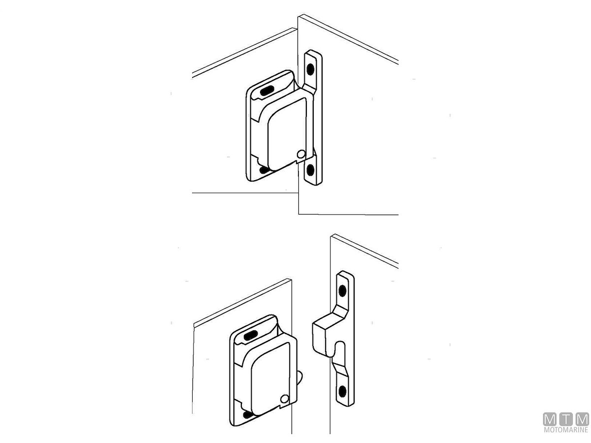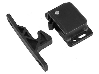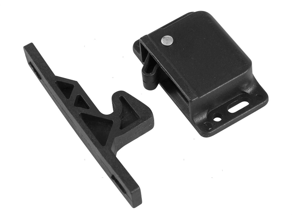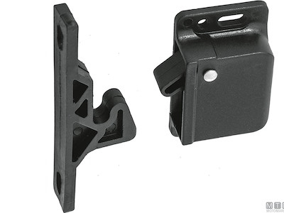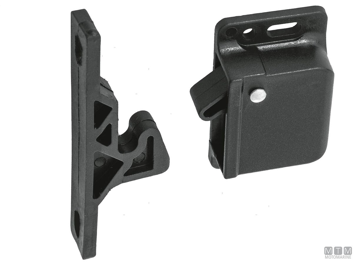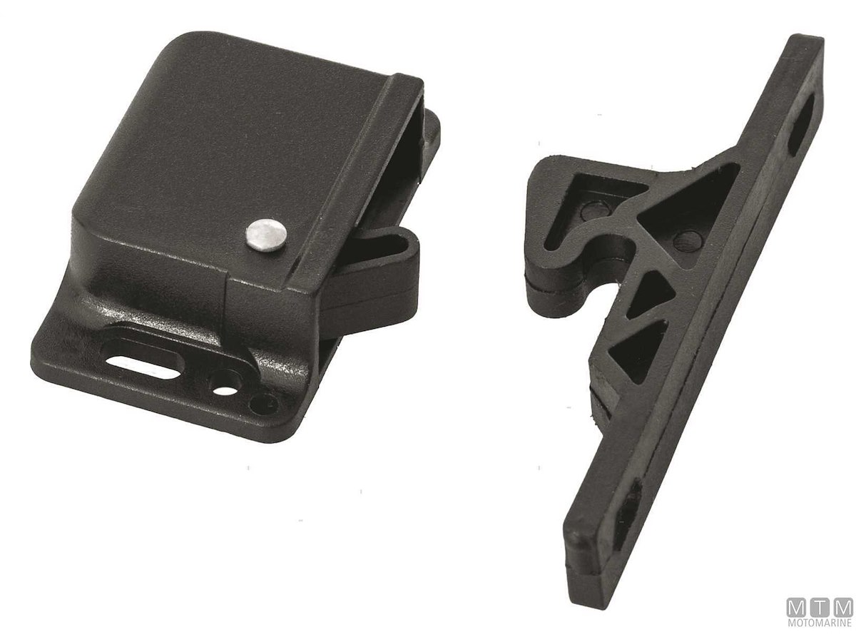 Arresto a spinta in plastica rinforzata per porte e portelli. Cod.: 0342703 Dim base mm: 48 x 28 x H14 Dim gancio mm: 73 x 11