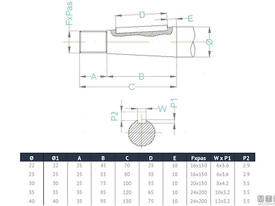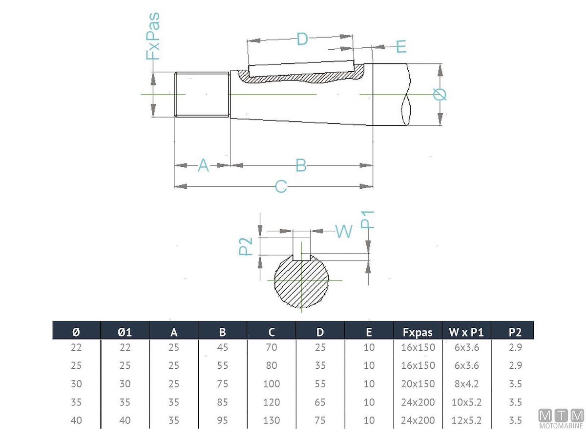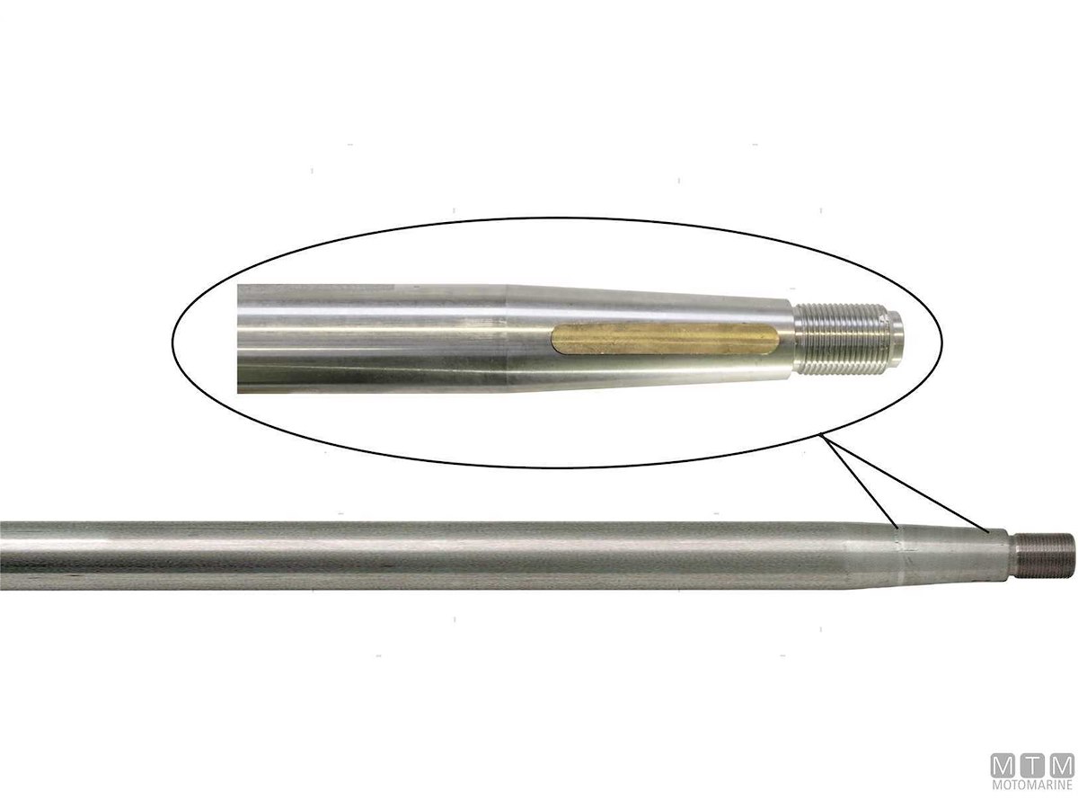 Assi porta elica in Acciaio Inox Duplex. Resistenza meccanica e resistenza alla corrosione superiori allo standard AISI316-A4. Trafilato e rettificato con lavorazione a cono e chiavetta porta elica.