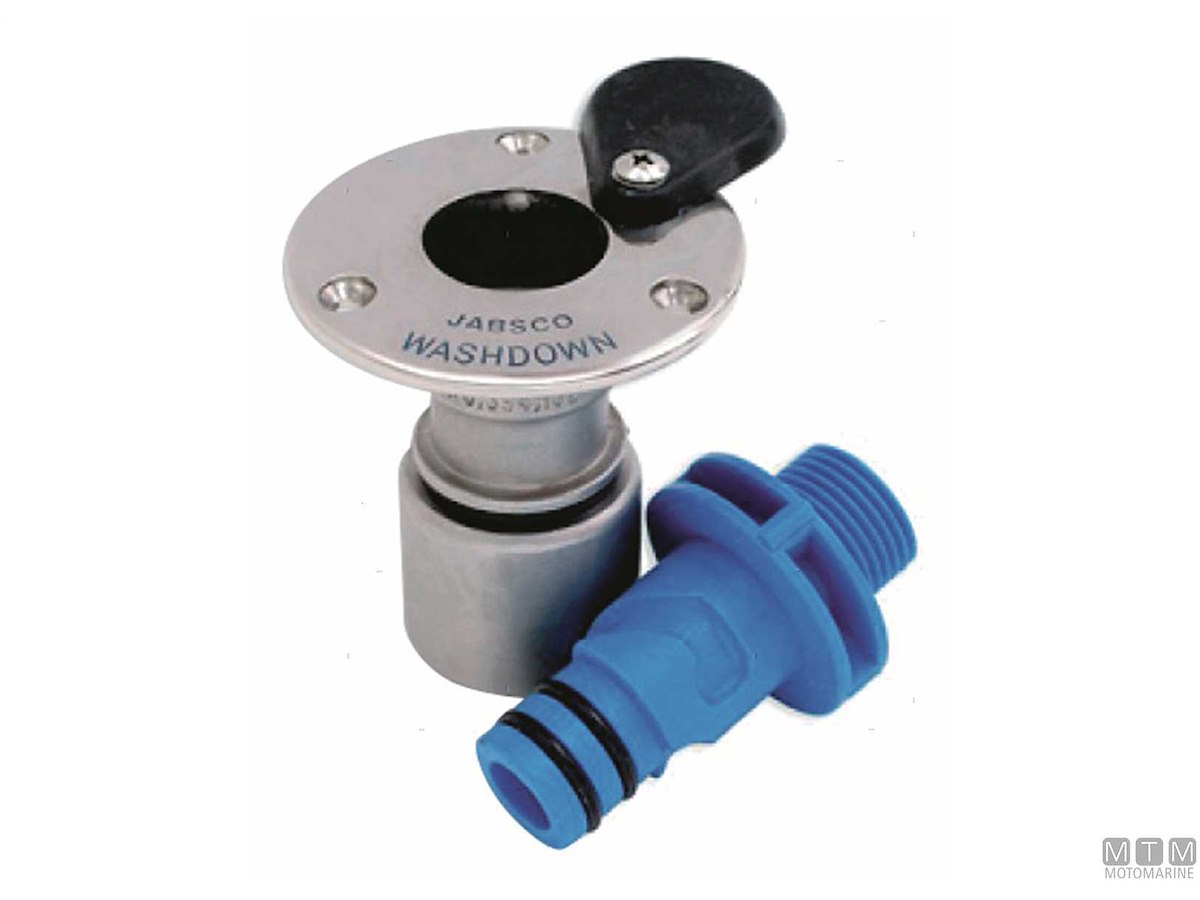 Attacco rapido da ponte in Acciaio Inox 316 con innesto per tubo acqua. Permette di attaccare e staccare rapidamente il tubo acqua anche sotto pressione mantenendo il ponte libero da ostacoli. Connessioni: sotto coperta attacco da 1/2" femmina, sopra coperta attacco da 3/4" maschio.
