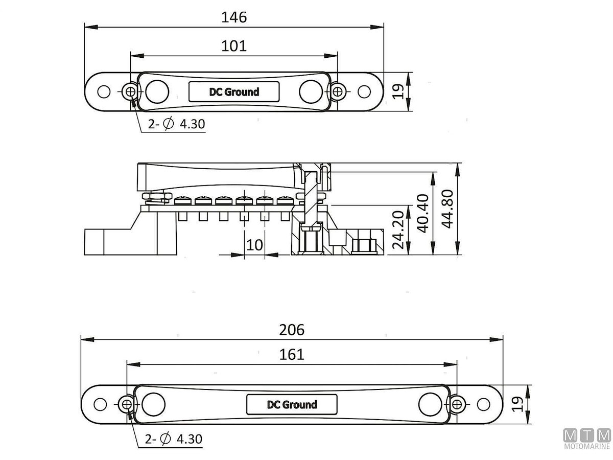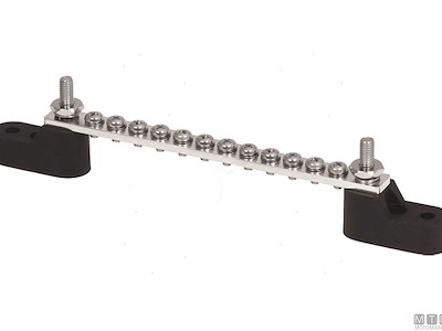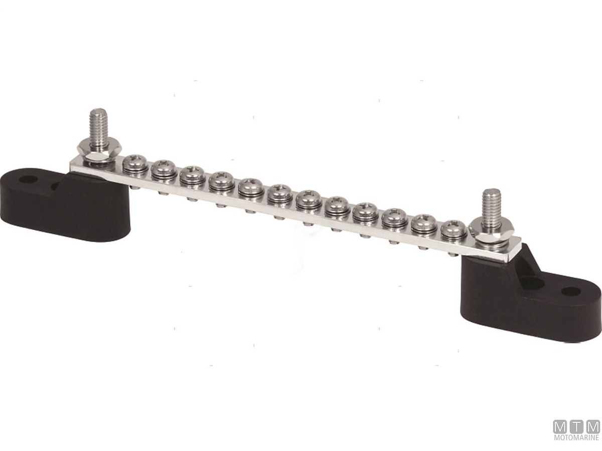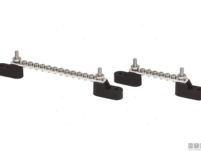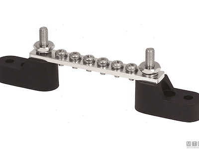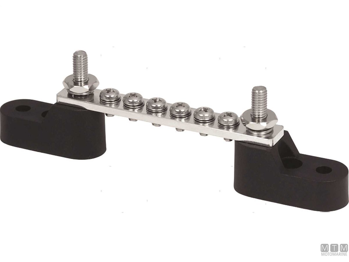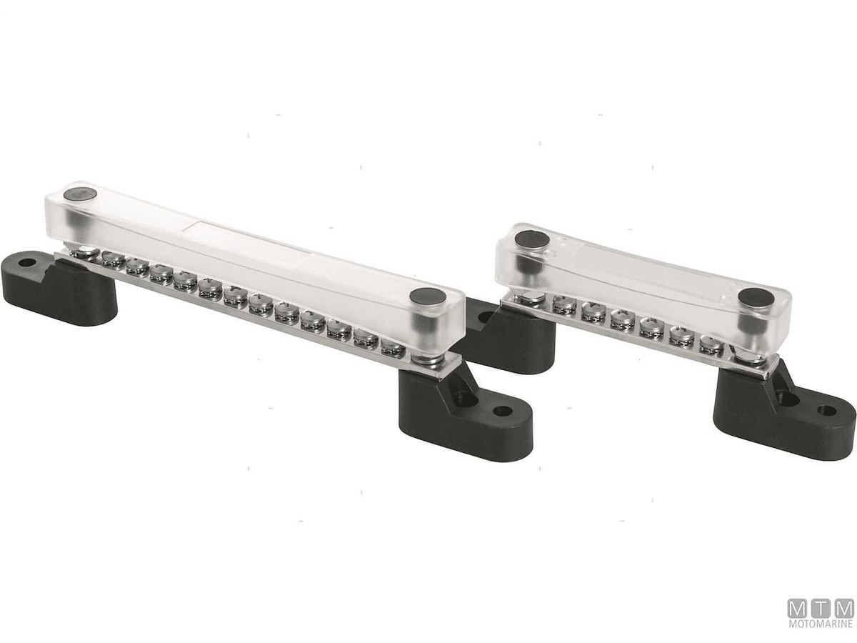 Barra di connessione in Ottone cromato con base isolata a ponte ideale per facilitare le connessioni. Completa di coperchio di protezione. Viti M4 con due perni M6.