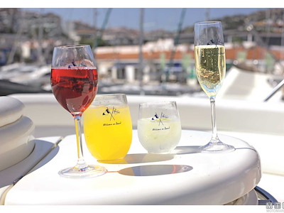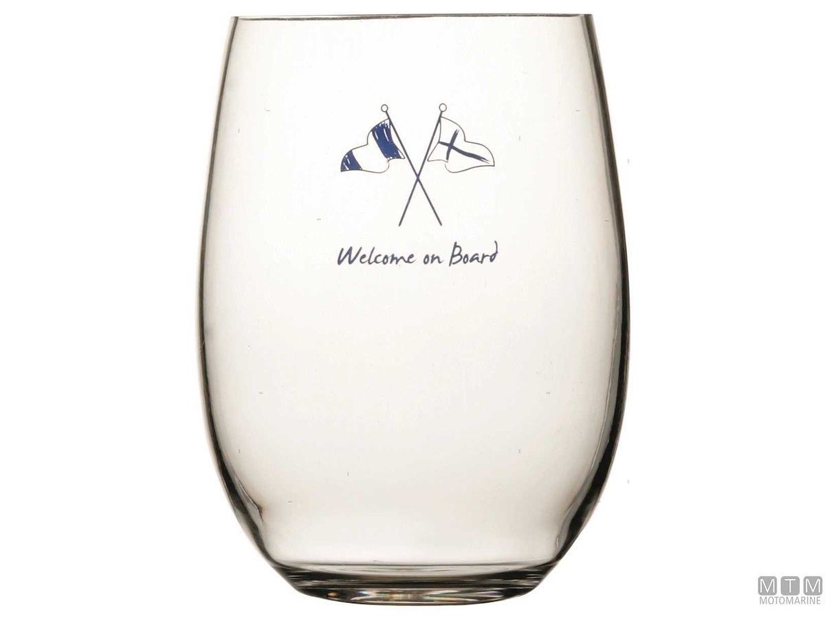 Bicchiere beverage con decoro Welcome On Board e base antiscivolo in confezione da 6 pezzi. In MS garantito 100% per uso alimentare. Lavabile in lavastoviglie, infrangibile e anti-macchia.