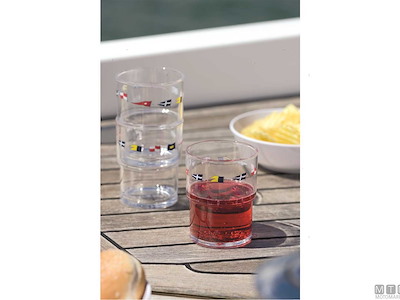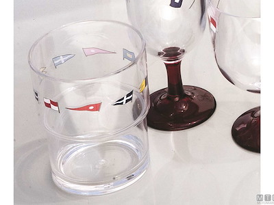 Bicchiere impilabile con decoro Regata in confezione da 12 pezzi. In MS garantito 100% per uso alimentare. Lavabile in lavastoviglie, infrangibile e anti-macchia.