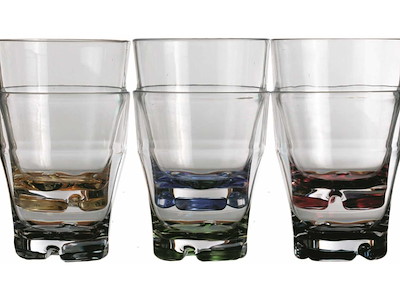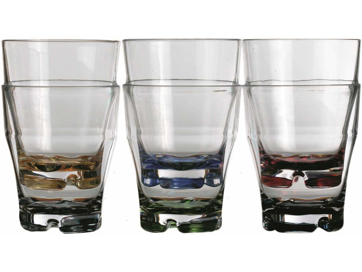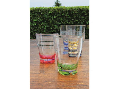 Bicchiere da acqua con base colorata in confezione da 6 pezzi. In MS garantito 100% per uso alimentare. Lavabile in lavastoviglie, infrangibile e anti-macchia.