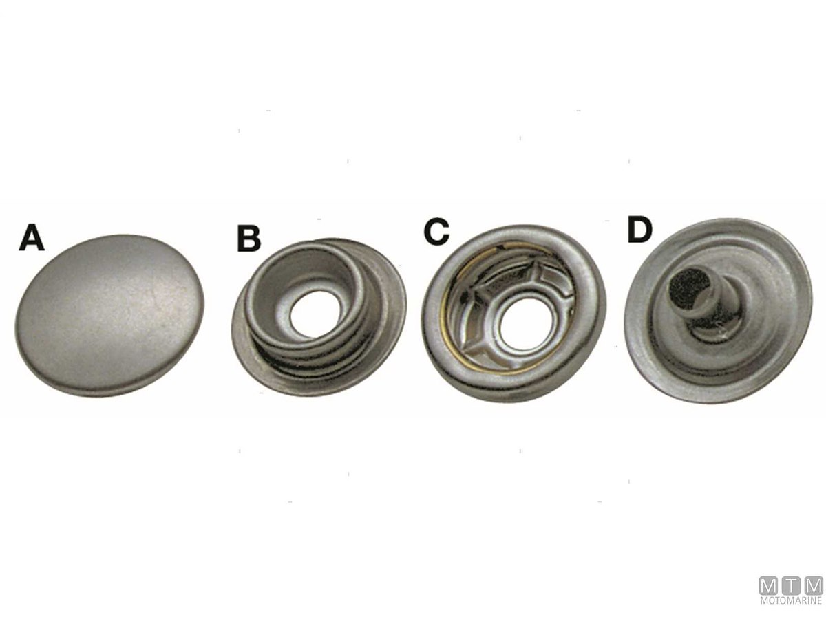 Bottoni a pressare in Ottone cromato. Diametro 15 mm. Testa: si pressa sulla sotto-testa con in mezzo il tessuto. Base: si fissa su legno, VTR e metalli. Sotto-base: si pressa alla base con in mezzo il tessuto per attaccare tessuto con tessuto.