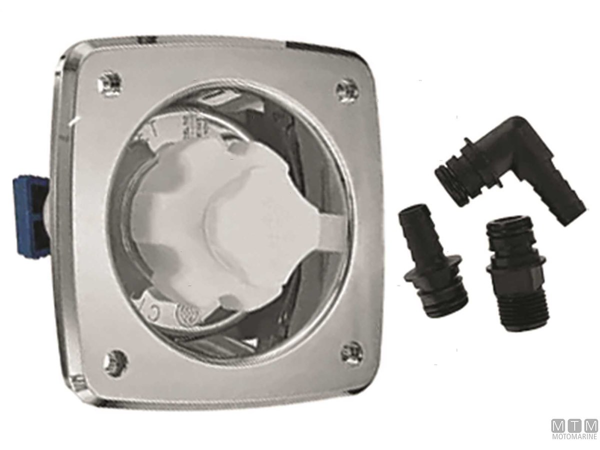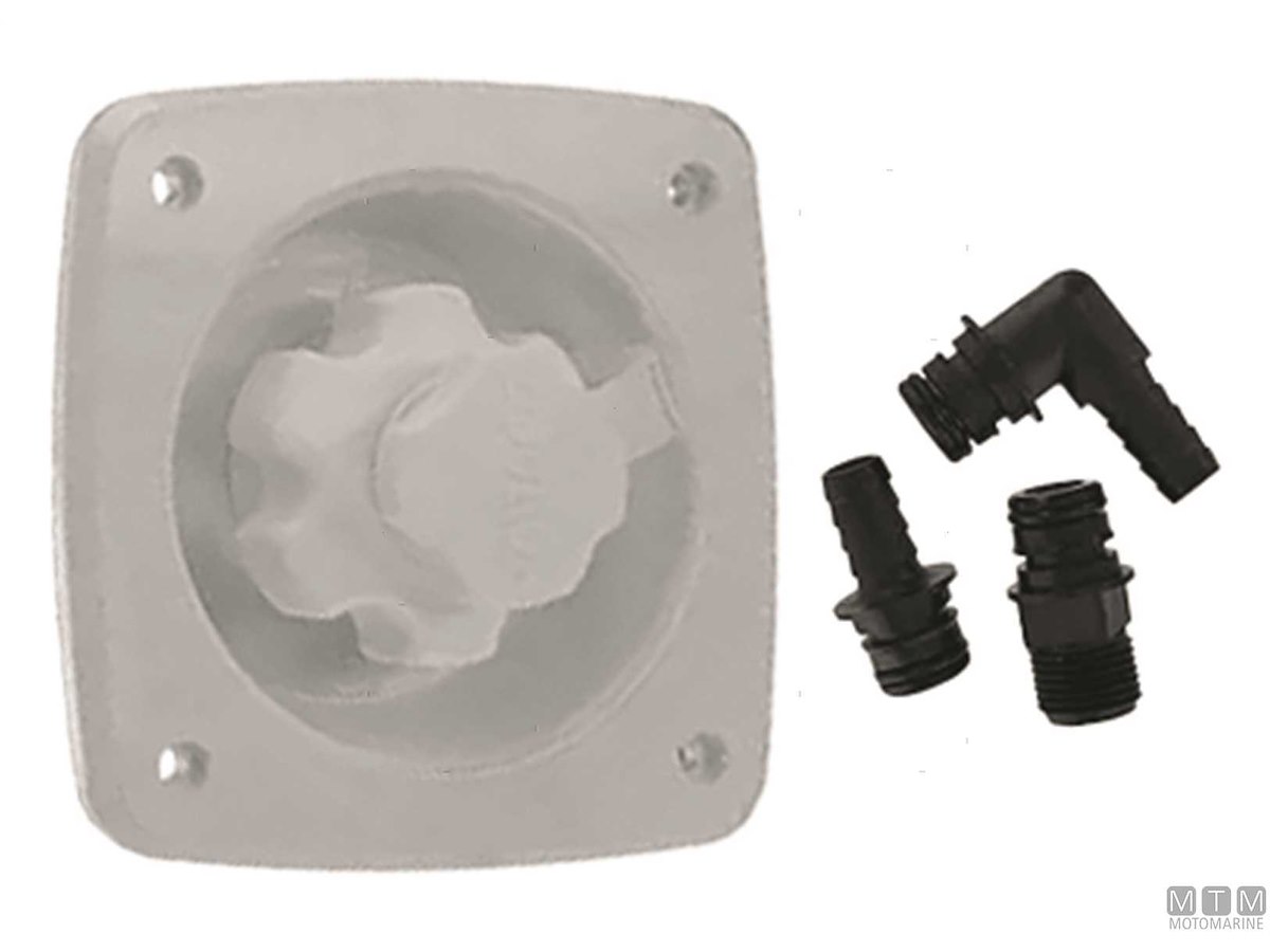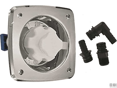 Box attacco entrata acqua ad incasso in plastica antiurto bianca oppure cromata. Completo di riduttore di pressione 3 Bar per non danneggiare le tubazioni di bordo quando si collega il circuito acqua con la banchina. Ingresso filettato 3/4" femmina, uscita con portagomma 12 mm.