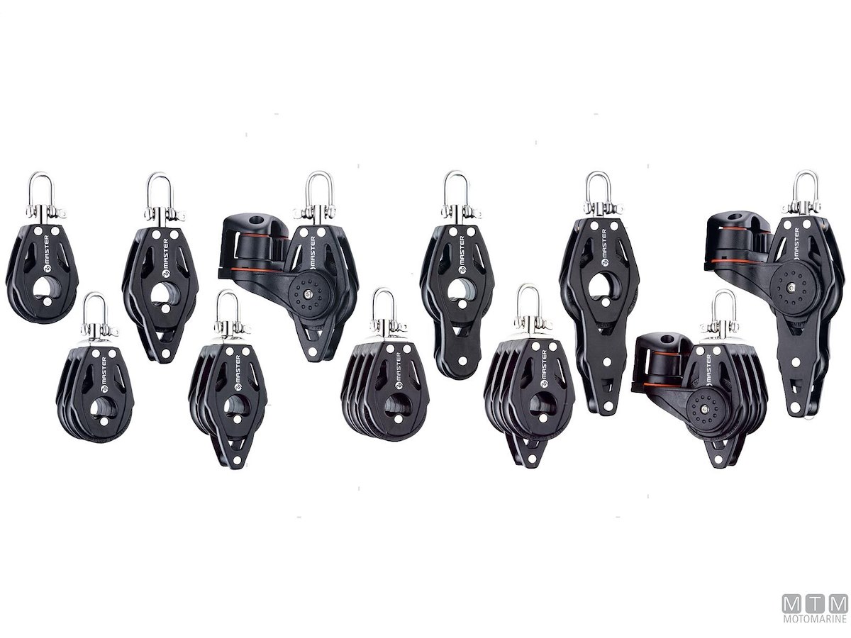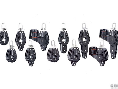 Bozzelli Master su sfere con puleggia da 57 mm. Cassa in materiale composito ultra leggero rinforzato con fibra e UV resistente. Il grillo girevole può essere bloccato in due posizioni grazie alla leva di blocco. Sfere ad alto scorrimento in Delrin stabilizzato UV. NB. Il carico di lavoro/rottura dei bozzelli con strozza scotte sono relativi allo strozza scotte.