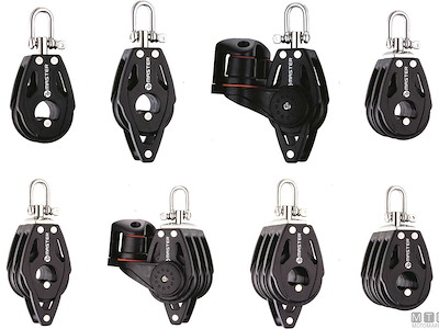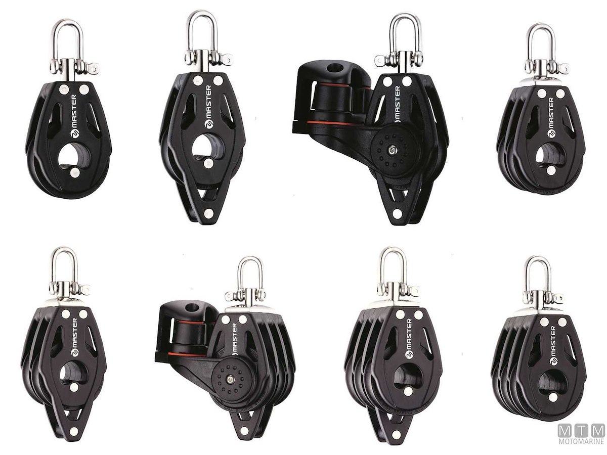 Bozzelli Master su sfere con puleggia da 75 mm. Cassa in materiale composito ultra leggero rinforzato con fibra e UV resistente. Il grillo girevole può essere bloccato in due posizioni grazie alla leva di blocco. Sfere ad alto scorrimento in Delrin stabilizzato UV. NB. Il carico di lavoro/rottura dei bozzelli con strozza scotte sono relativi allo strozza scotte.