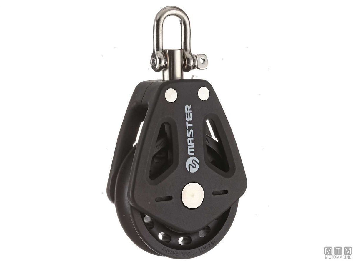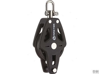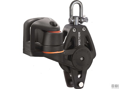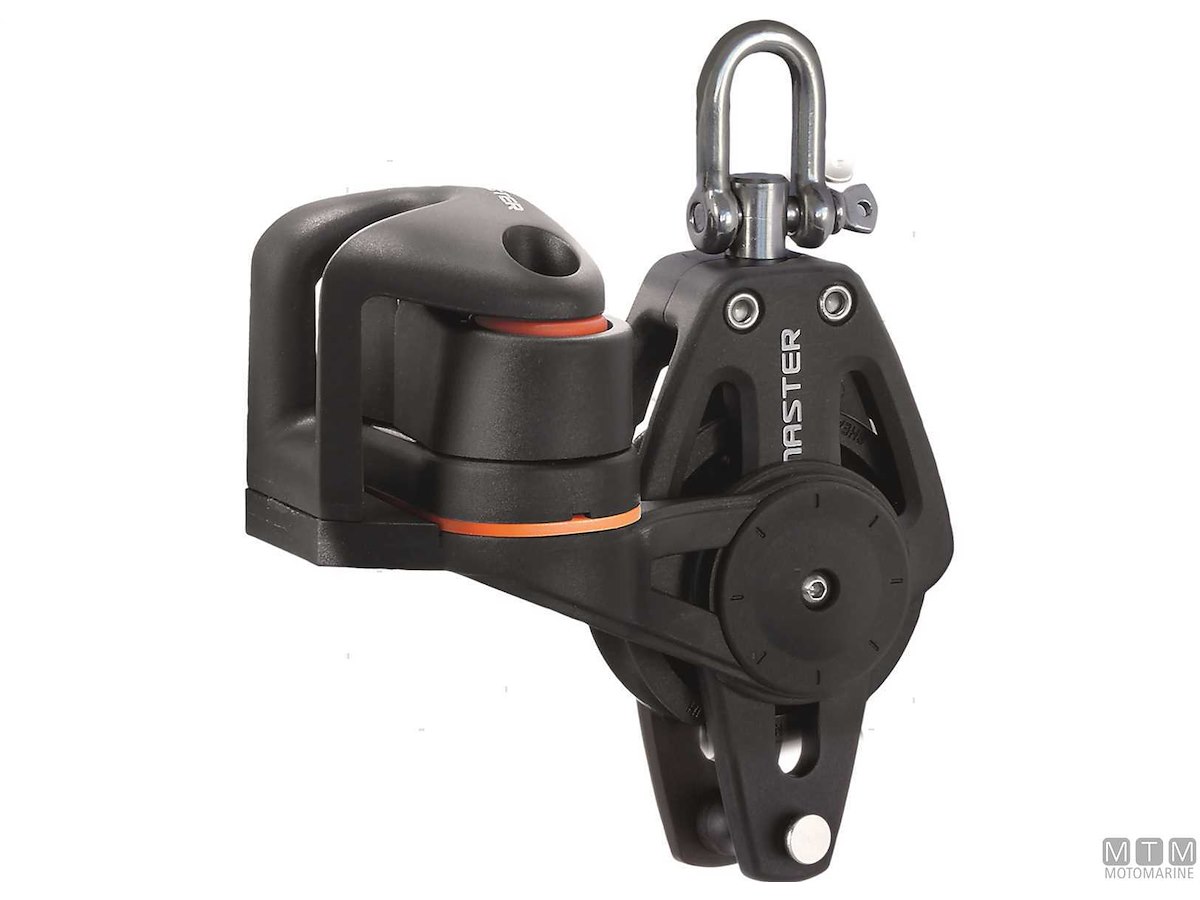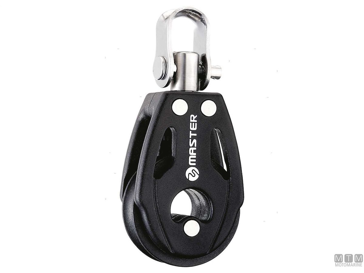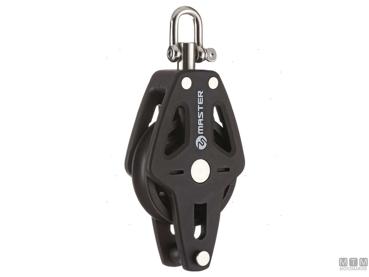 Bozzelli Master su boccola con grande capacità di carico e puleggia da 50 mm. Cassa in materiale composito ultra leggero rinforzato con fibra e UV resistente. Il grillo girevole può essere bloccato in due posizioni grazie alla leva di blocco.