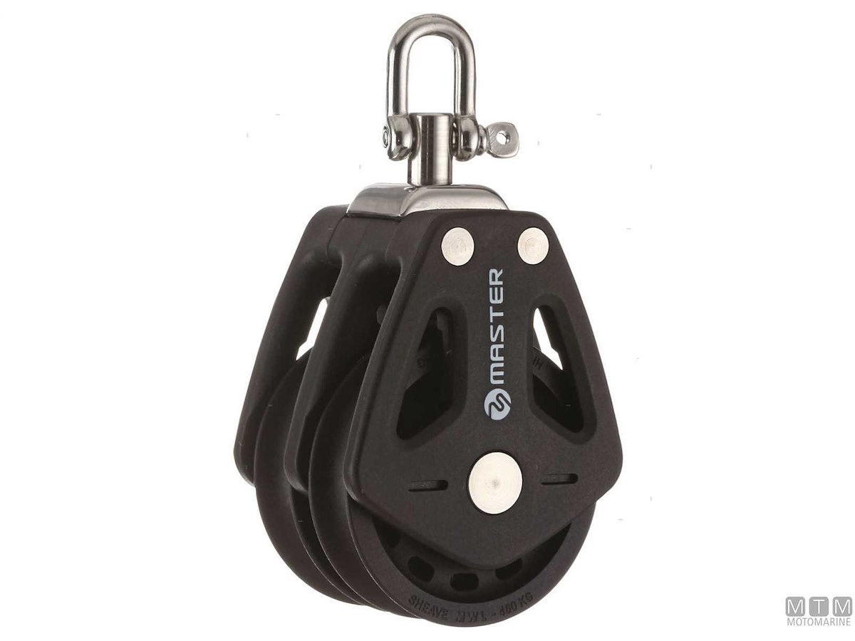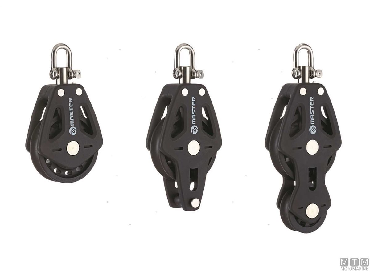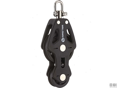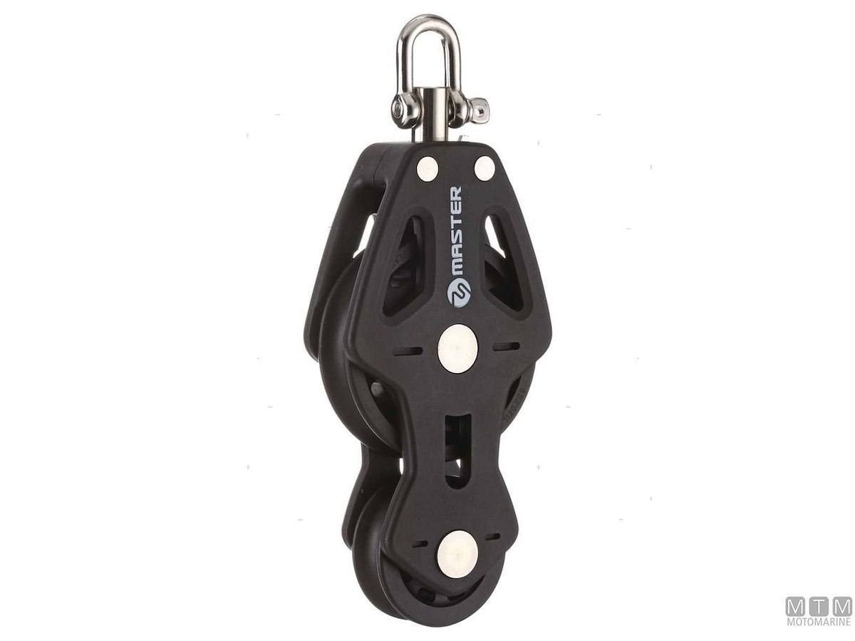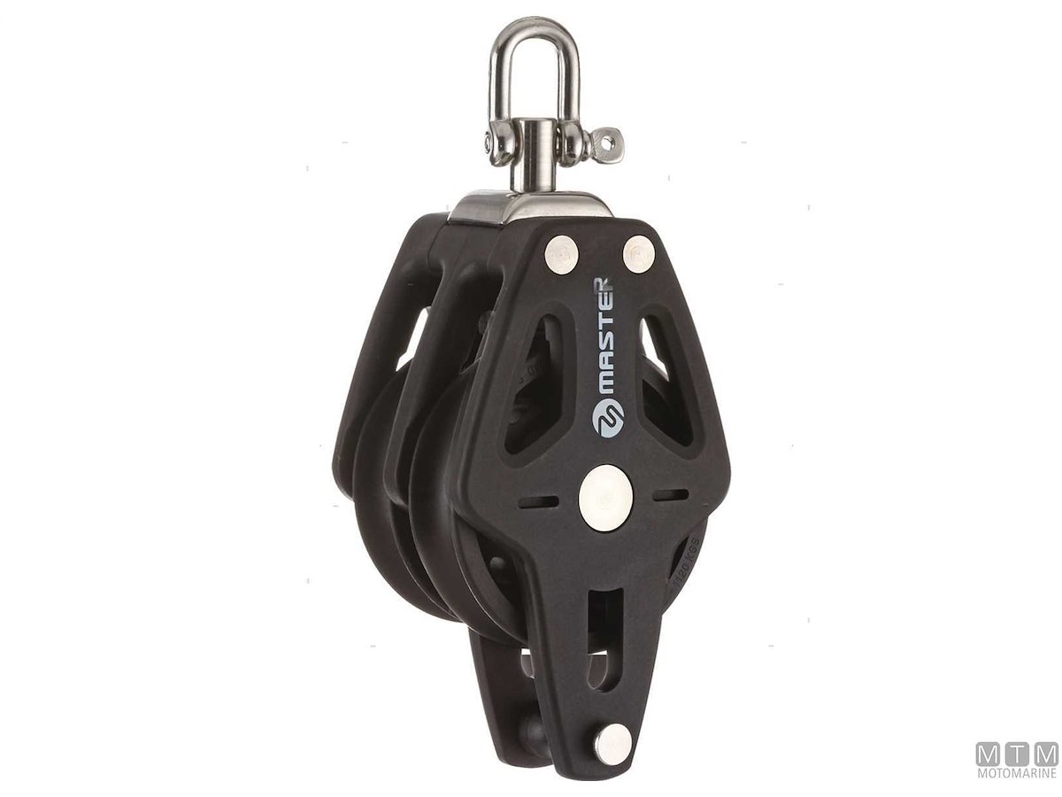 Bozzelli Master su boccola con grande capacità di carico e puleggia da 50 mm. Cassa in materiale composito ultra leggero rinforzato con fibra e UV resistente. Il grillo girevole può essere bloccato in due posizioni grazie alla leva di blocco.