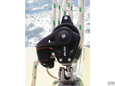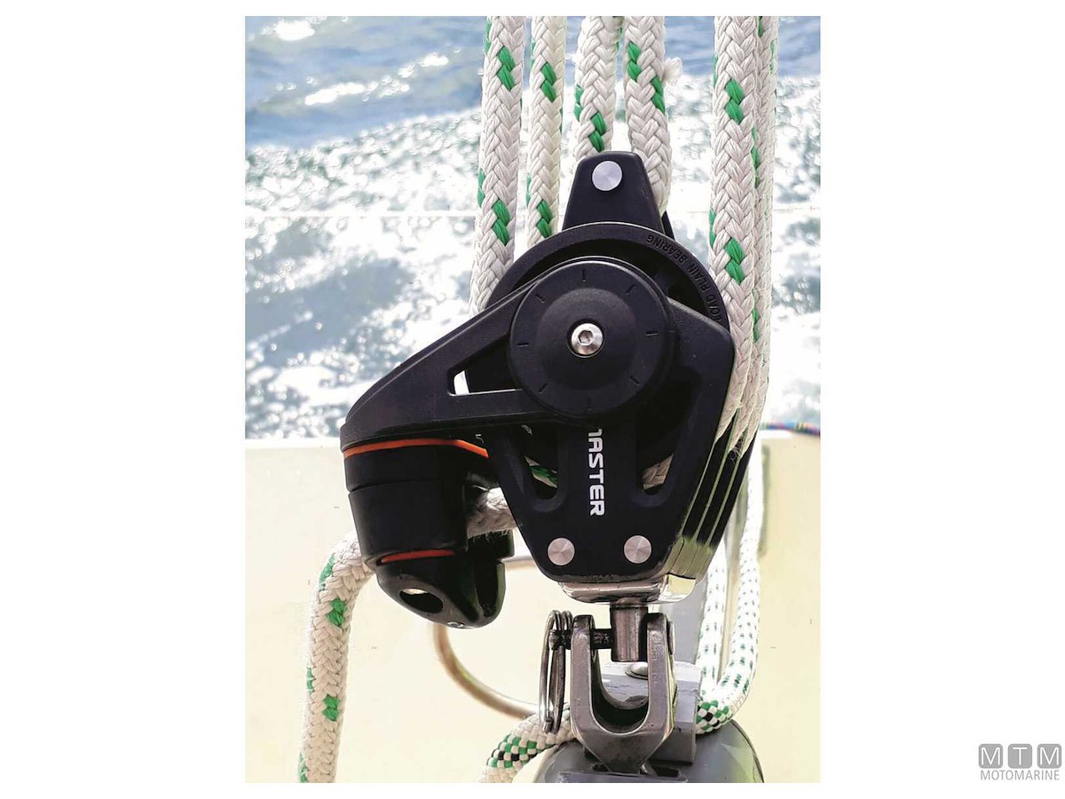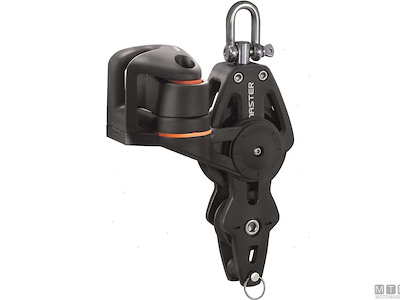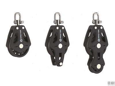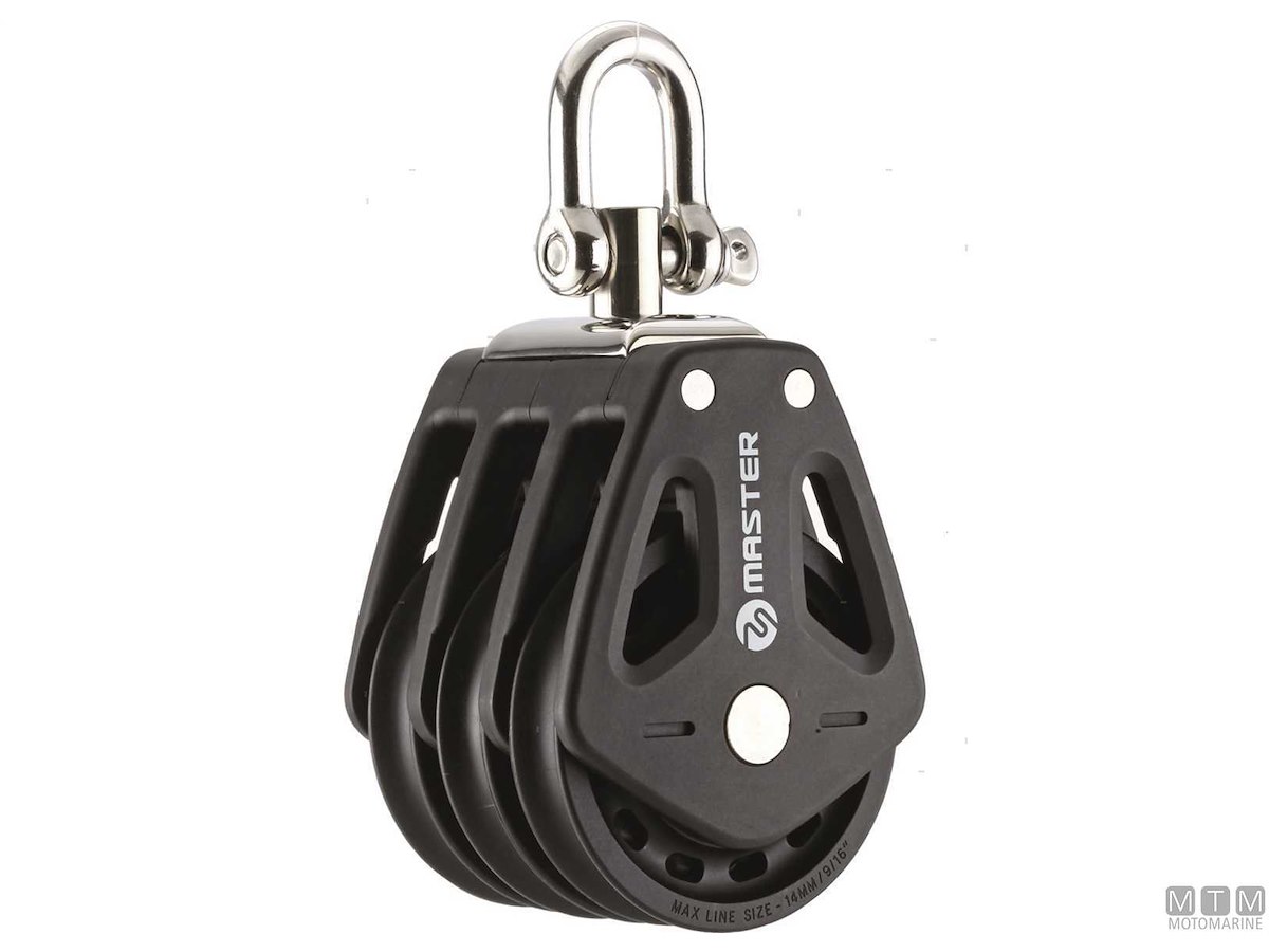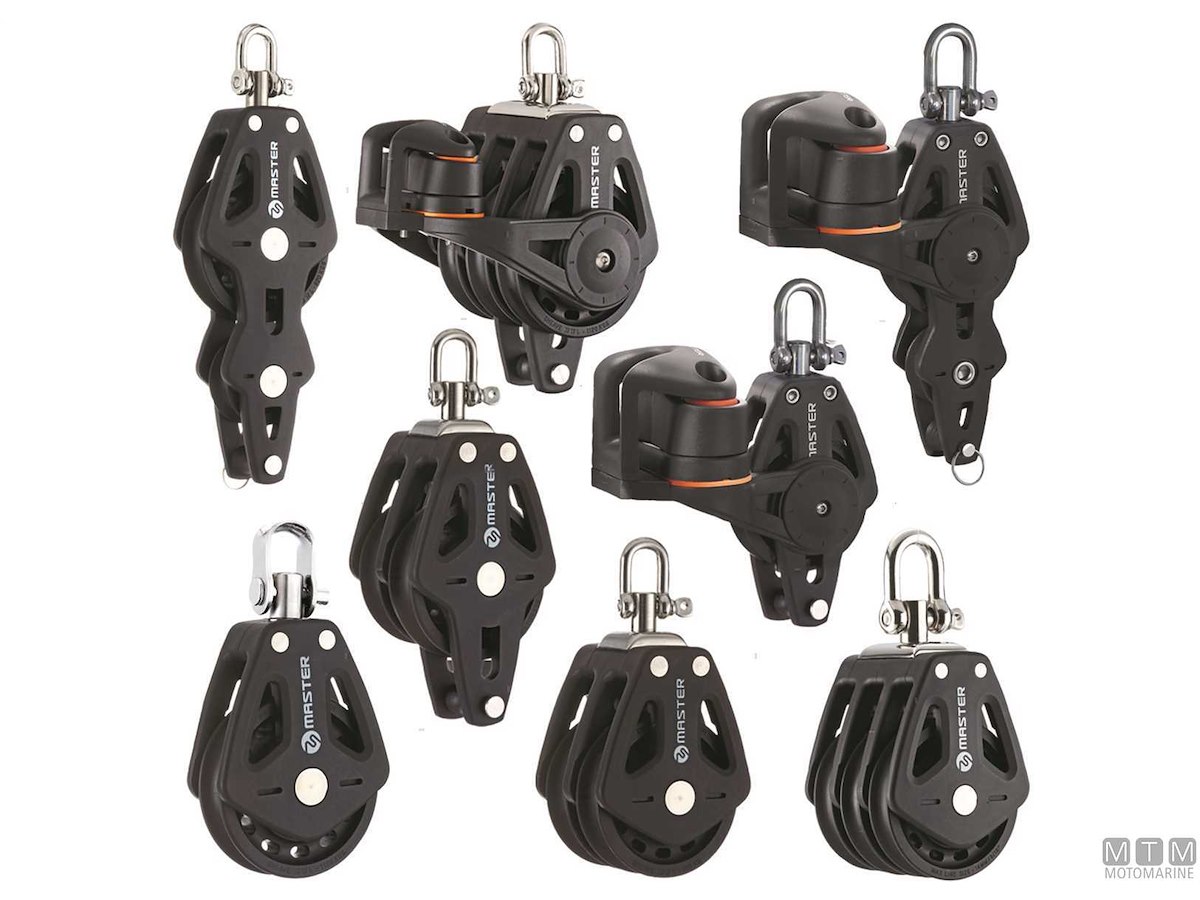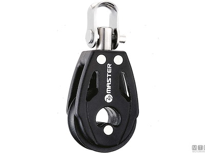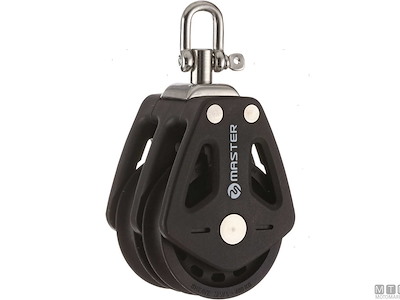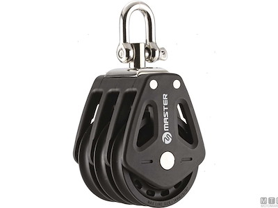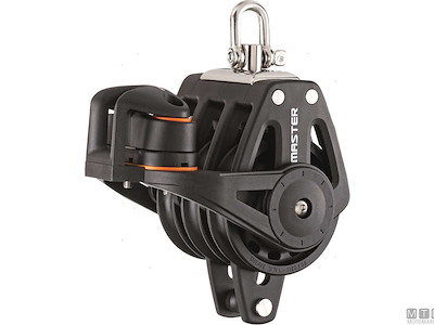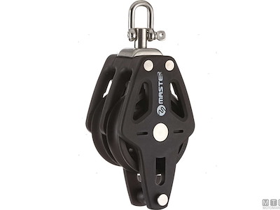 Bozzelli Master su boccola con grande capacità di carico e puleggia da 50 mm. Cassa in materiale composito ultra leggero rinforzato con fibra e UV resistente. Il grillo girevole può essere bloccato in due posizioni grazie alla leva di blocco.