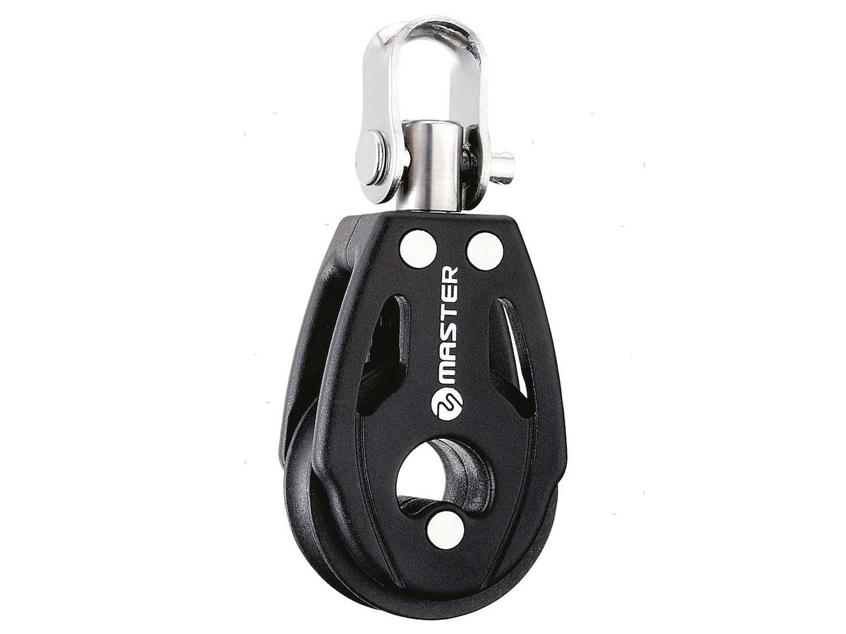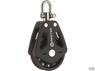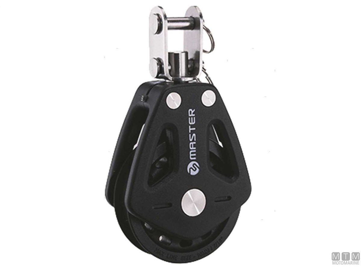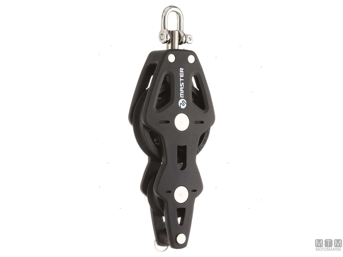Bozzelli Master su boccola con grande capacità di carico e puleggia da 60 mm. Cassa in materiale composito ultra leggero rinforzato con fibra e UV resistente. Il grillo girevole può essere bloccato in due posizioni grazie alla leva di blocco.