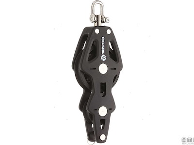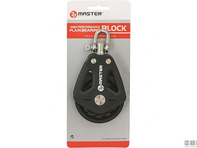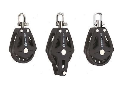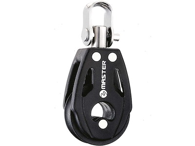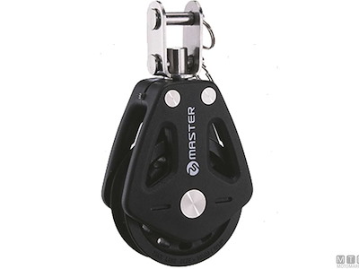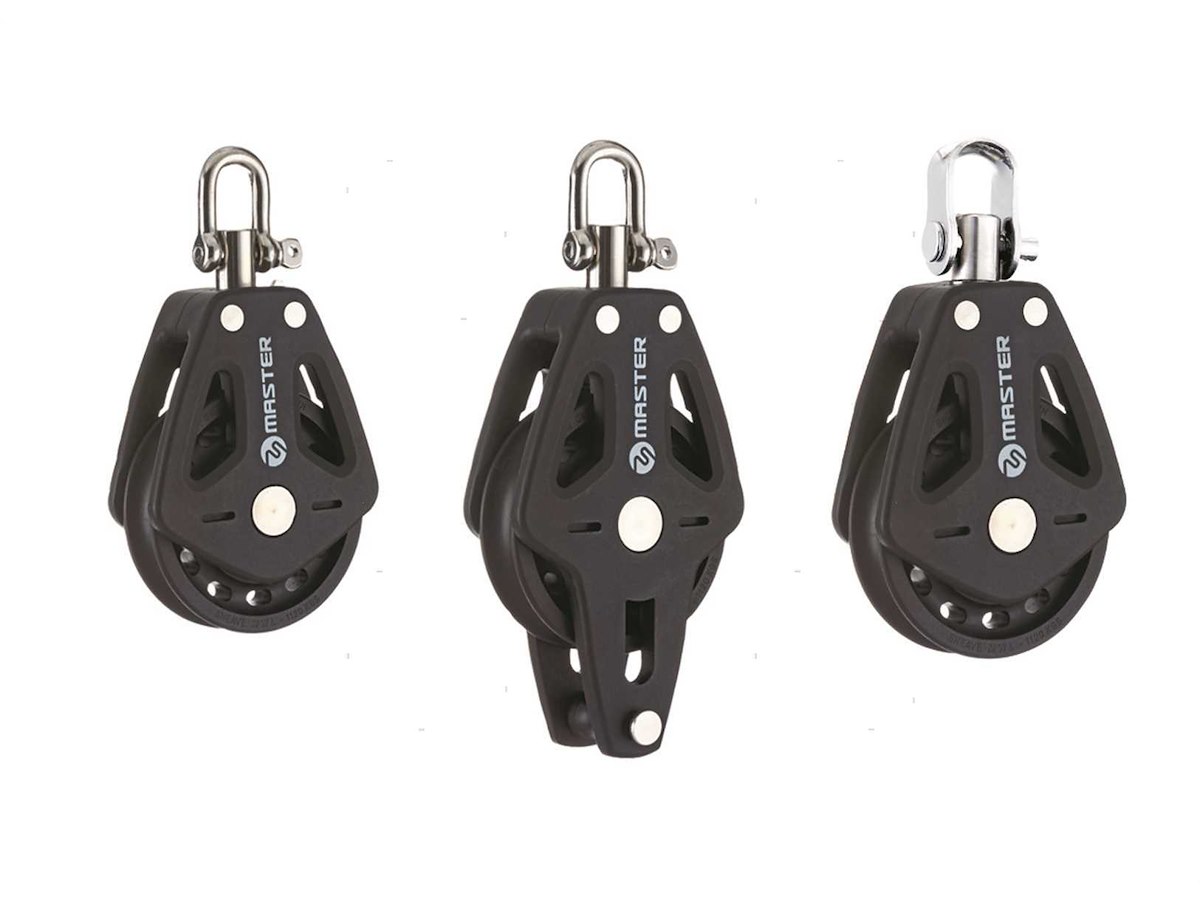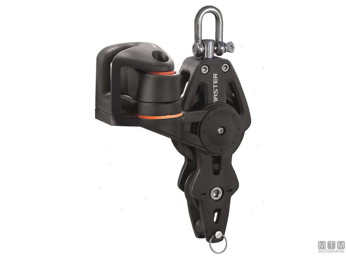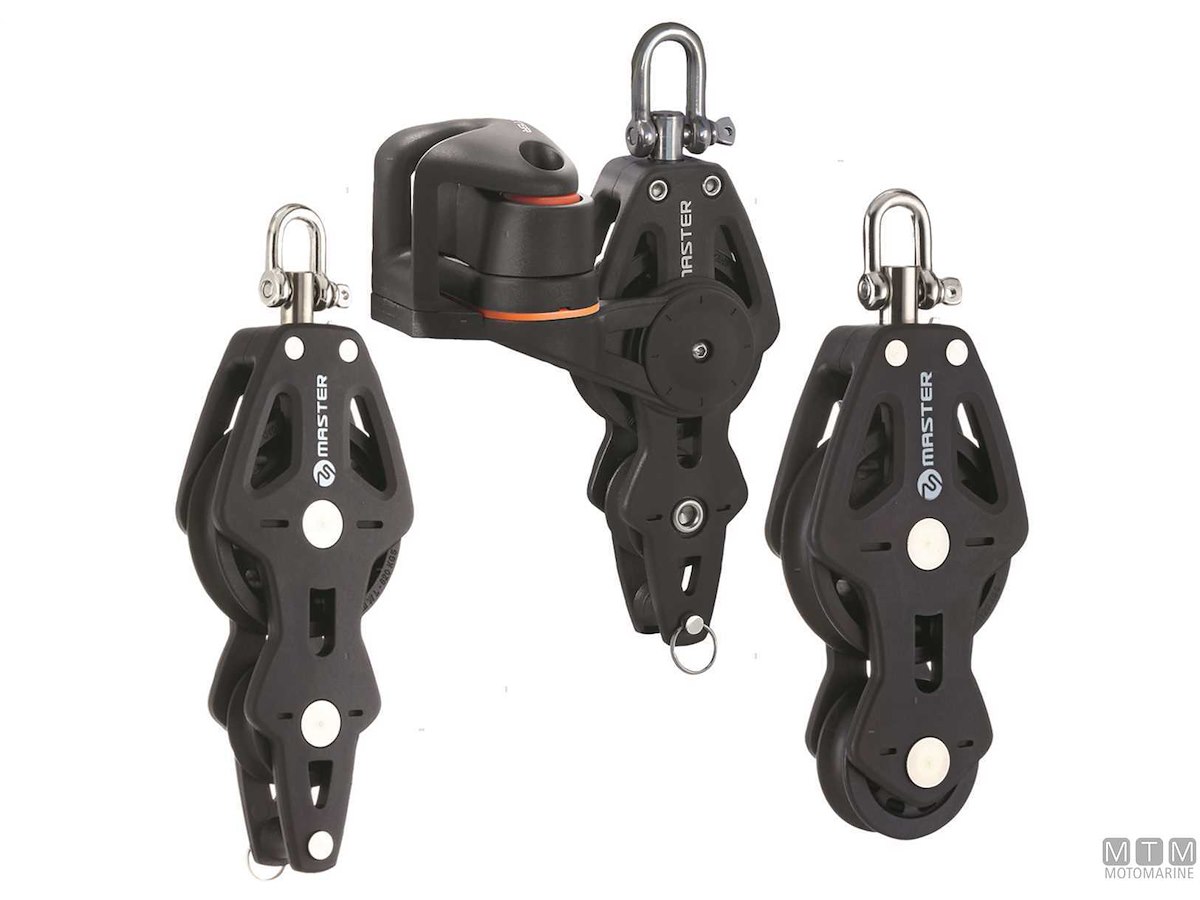 Bozzelli Master su boccola con grande capacità di carico e puleggia da 60 mm. Cassa in materiale composito ultra leggero rinforzato con fibra e UV resistente. Il grillo girevole può essere bloccato in due posizioni grazie alla leva di blocco. NB. Il carico di lavoro/rottura dei bozzelli con strozza scotte sono relativi allo strozza scotte.
