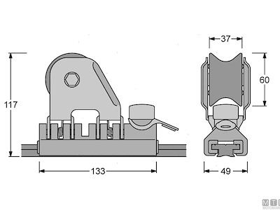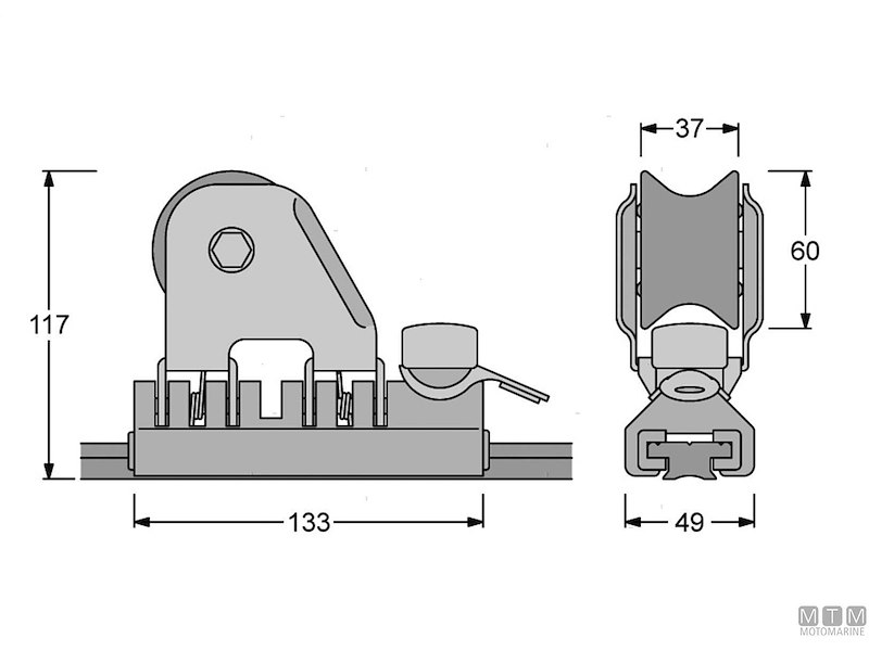 Carrello in Alluminio ossidato Nero su pattini in Nylon a basso attrito. Supporto puleggia in Acciaio AISI 316 orientabile (± 50°). Puleggia in resina con doppio cuscinetto laterale a sfere (self/captive) a sezione allargata per il passaggio della doppia scotta. Fermo d’arresto in Acciaio AISI 316 con posizione di disinserimento. Arricavo frontale.