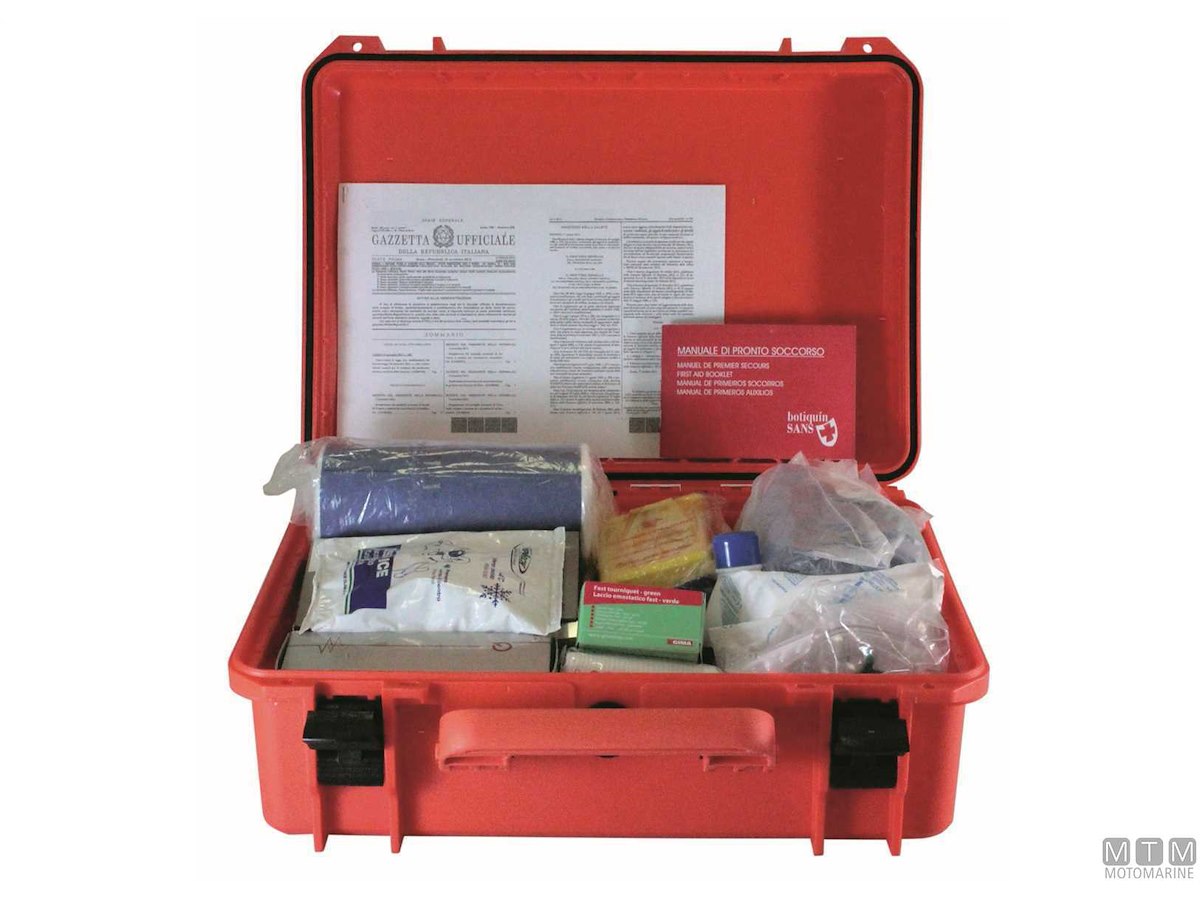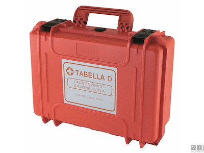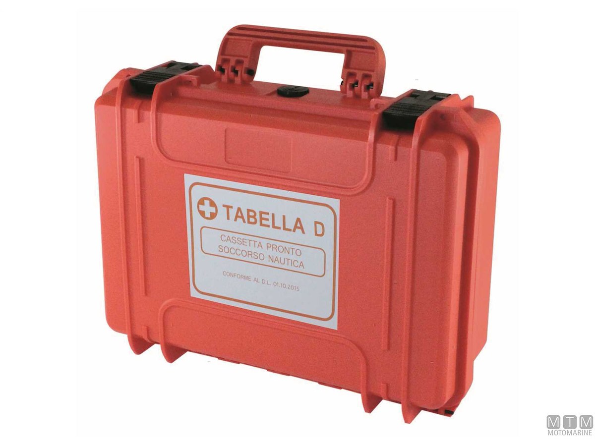 Cassetta pronto soccorso valigetta in contenitore stagno IP67 con guarnizione ermetica, valvola automatica di pressurizzazione, manico ergonomico, chiusura di sicurezza a doppio step e doppia predisposizione lucchetto. Contenuto come da tabella D, regolamentare DM 10/03/2022 per naviglio:
