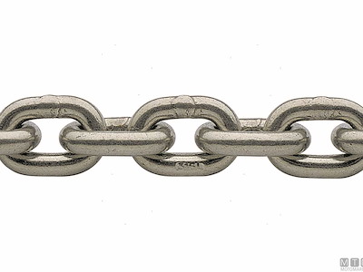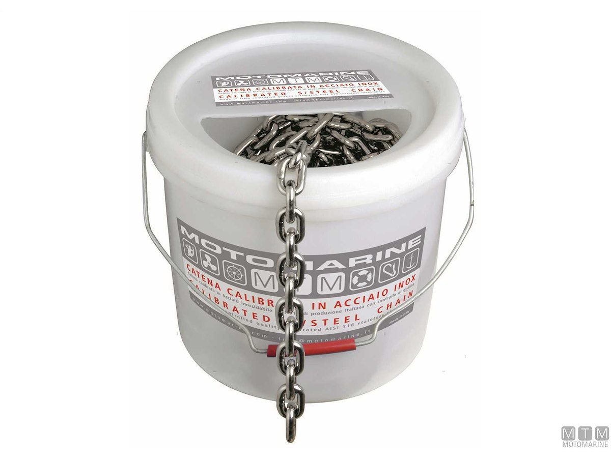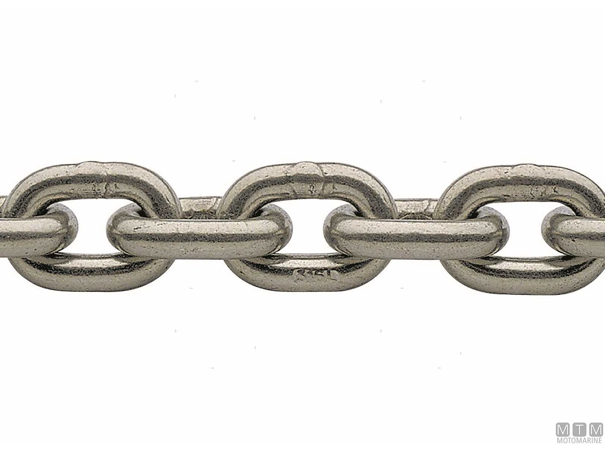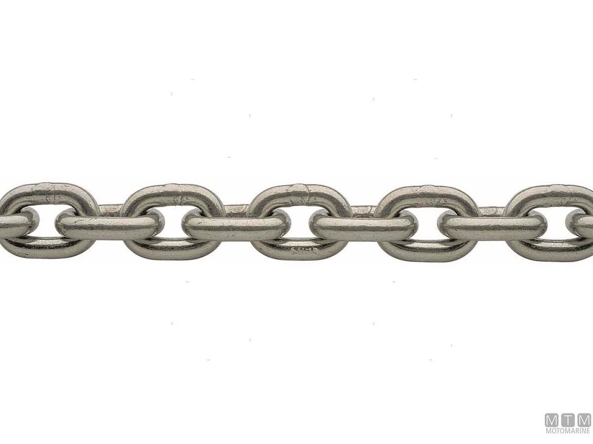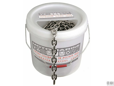 Catena calibrata DIN766 in acciaio inox AISI 316L per verricelli salpa ancora.Produzione controllata Grado G40 con elevato carico di rottura.NB: il carico di rottura della catena è 4 volte il carico di lavoro.Matasse disponibili da 30, 50, 75 o 100 metri.