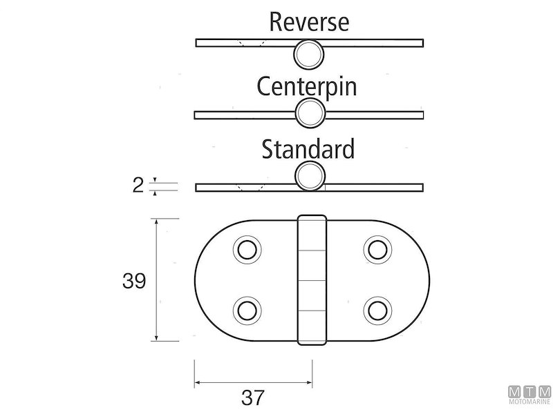 Cerniera a biscotto senza spigoli in Acciaio Inox Extracrome. Standard = Perno Superiore Centerpin = Perno Centrale Reverse = Perno Inferiore