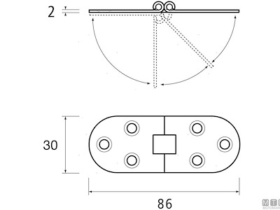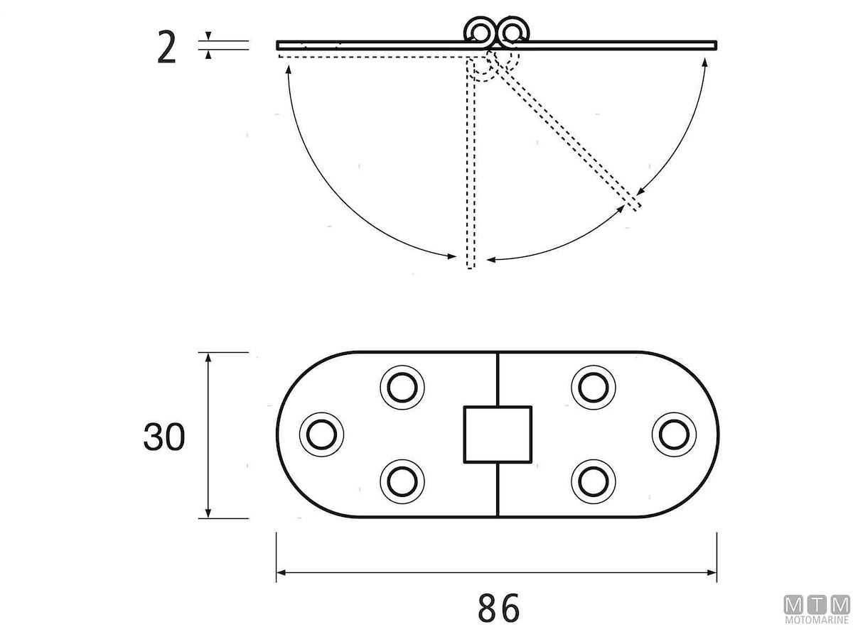 Cerniera con blocco di apertura a 180° in Acciaio Inox per piani tavolo e gavoni. Cod.: 0402208 mm: H30 x L86