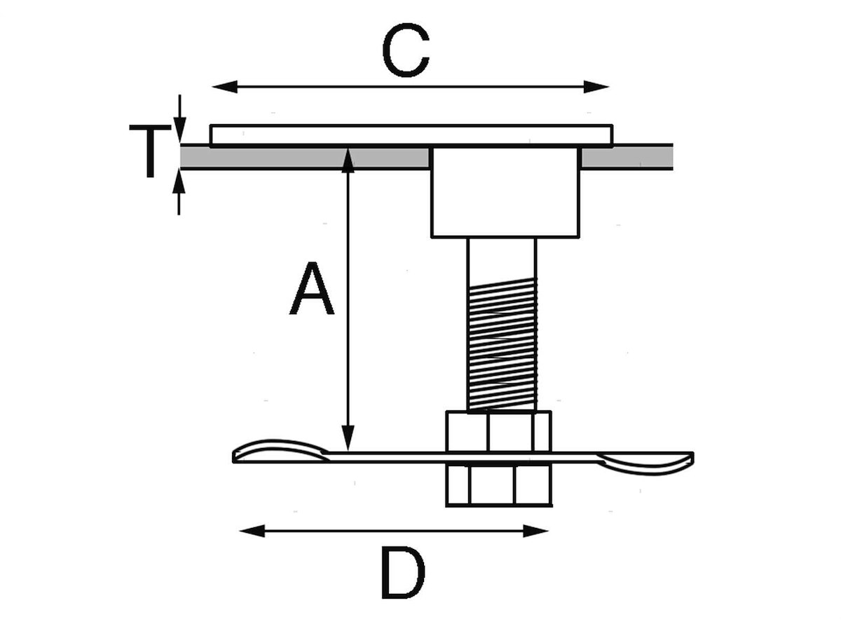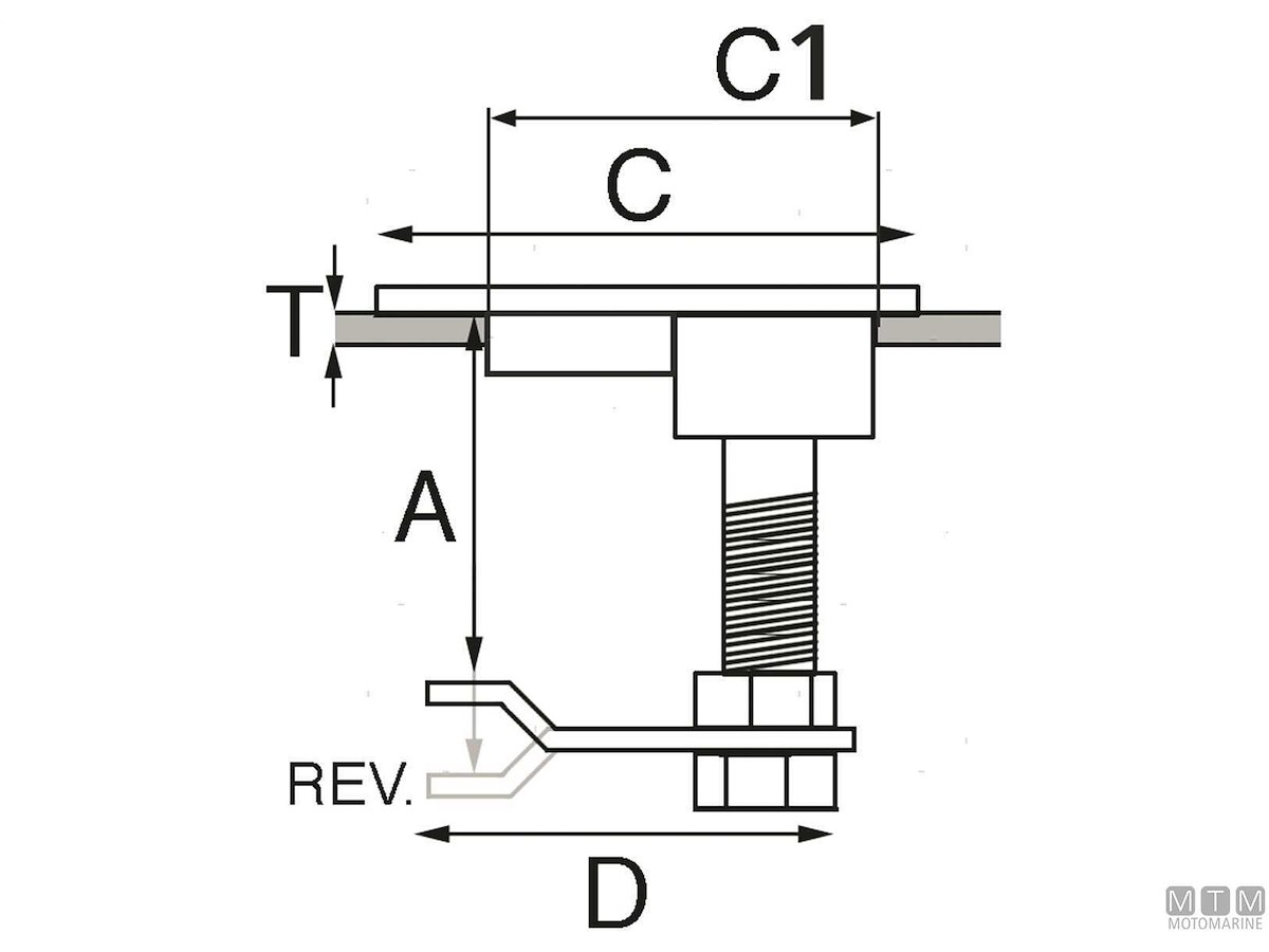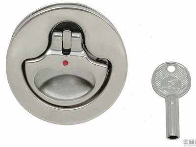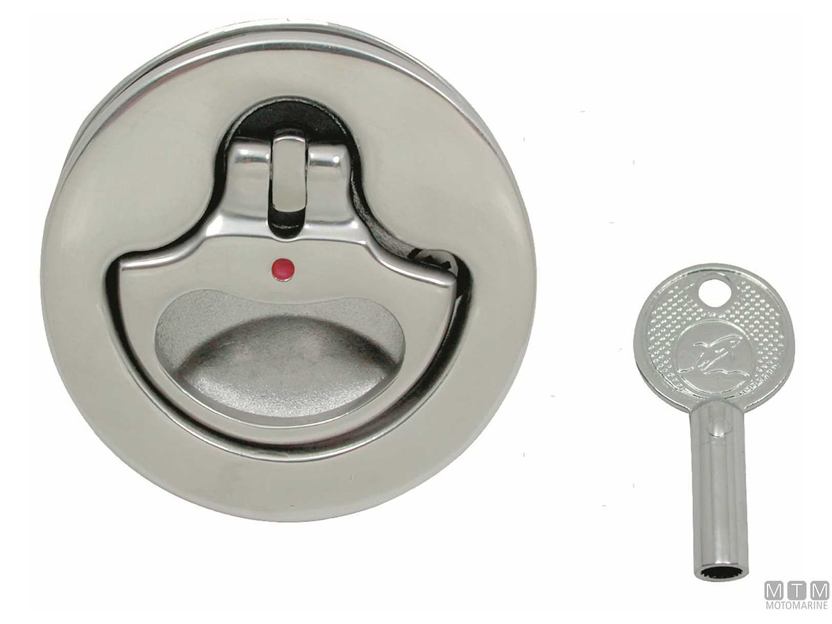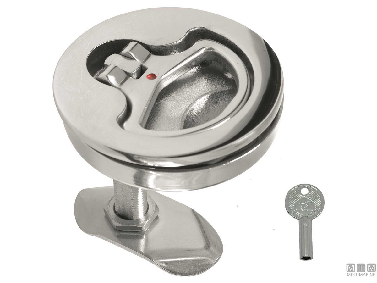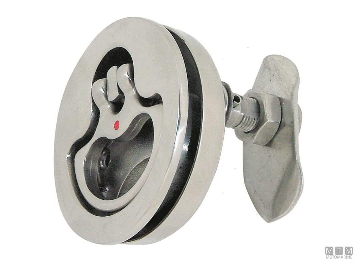Chiusura a compressione tonda in Acciaio Inox con tavella regolabile. Piastra a vista con fori vite nascosti dalla maniglia, montaggio con viti dall'esterno. Per aprire e chiudere paglioli e boccaporti.