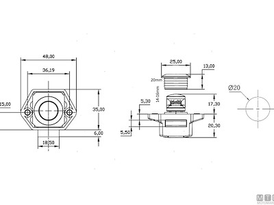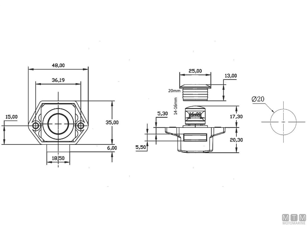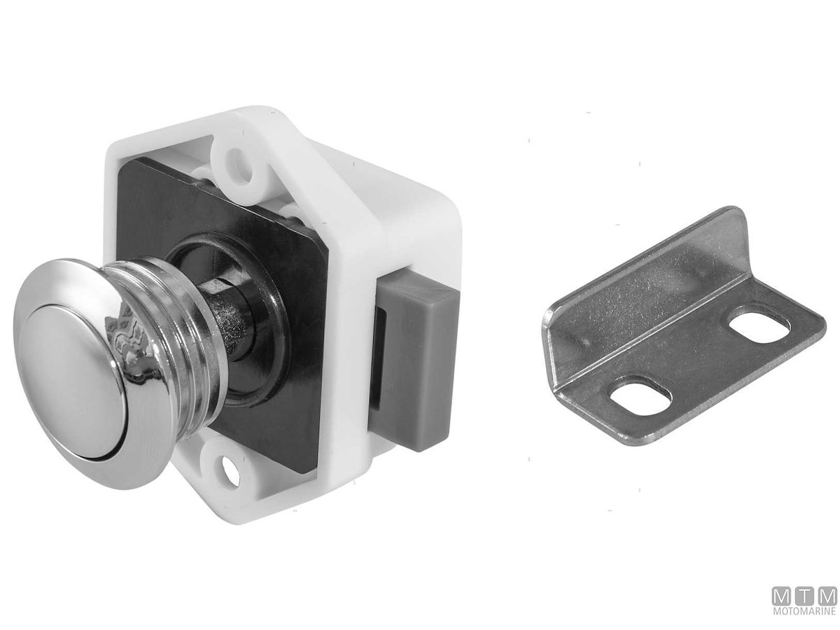 Chiusura a pulsante per portelli e cassetti completa di scontro e viteria. Cassa in ABS, pulsante cromato e parti meccaniche in lega Zamac. Dimensioni 35 x 48 mm.
