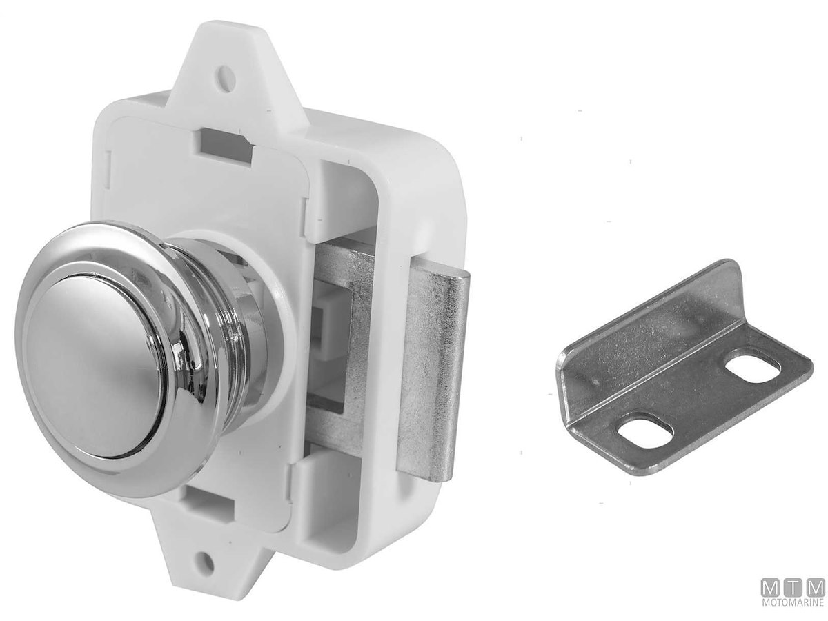 Chiusura a pulsante per portelli e cassetti completa di scontro e viteria. Cassa in ABS, pulsante cromato e parti meccaniche in lega Zamac. Dimensioni 45 x 78 mm.