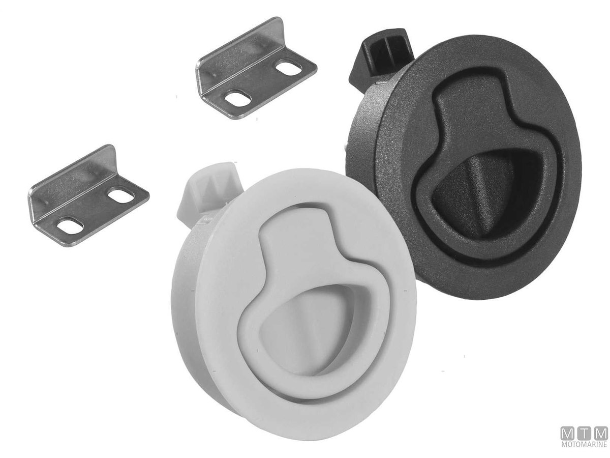 Chiusura a spinta per portelli e paglioli completa di scontro e viteria. Corpo in Nylon con montaggio a incasso.