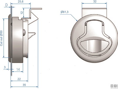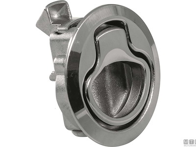 Chiusura a spinta Roca per portelli e paglioli con montaggio a incasso. Corpo in Acciaio Inox AISI 316 lucidato a specchio con componenti antivibranti. Cod.: 0342262 ø Foro mm: 50 ø Esterno mm: 61 D mm: 2<>22
