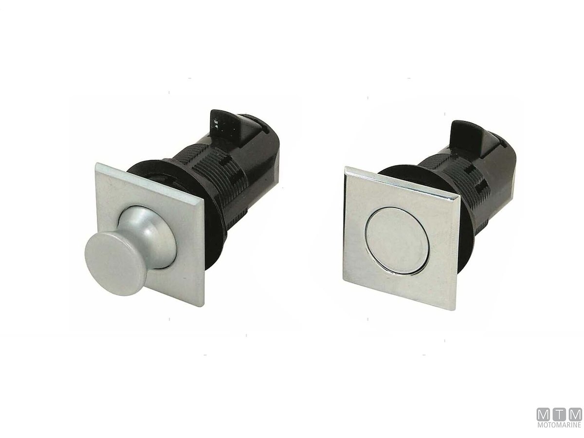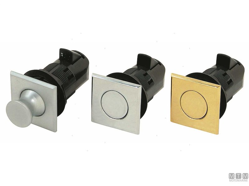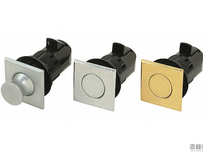 Chiusura a spinta Southco con pulsante a filo e flangia quadra. Il pulsante a scatto rimane a filo in posizione chiusa e fuoriesce in posizione aperta. Corpo e dado in Nylon Nero, flangia e pomello in Ottone. Da completare con un aggancio fisso o regolabile.