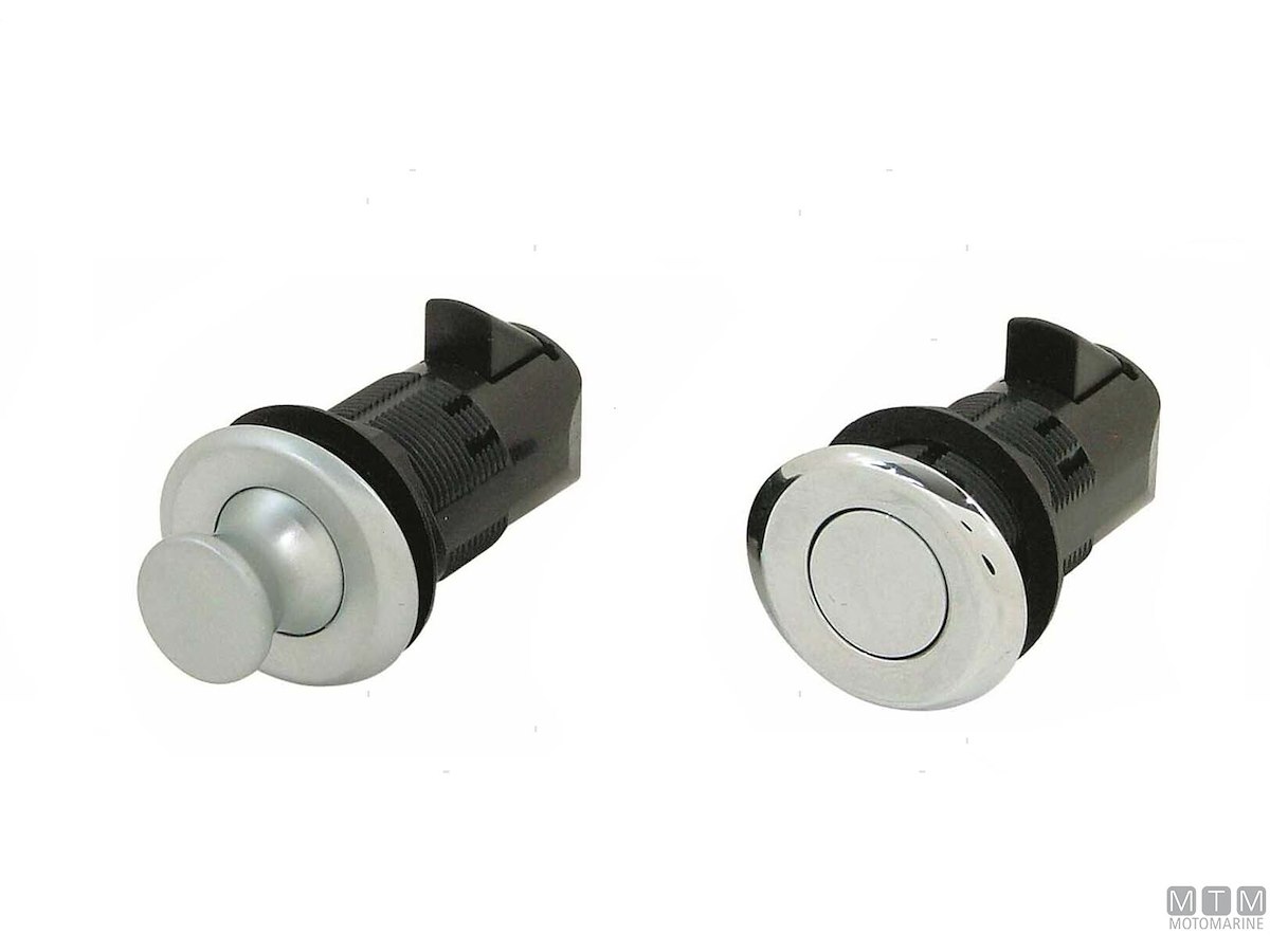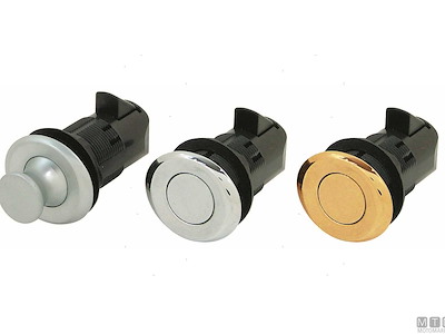 Chiusura a spinta Southco con pulsante a filo e flangia tonda. Il pulsante a scatto rimane a filo in posizione chiusa e fuoriesce in posizione aperta. Corpo e dado in Nylon Nero, flangia e pomello in Ottone. Da completare con un aggancio fisso o regolabile.