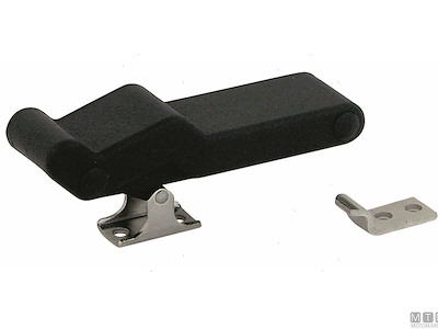 Chiusura in Elastomero Termoplastico amortizzato per portelli e cassoni. Rivetto, aggancio, supporto e spine in Acciaio Inox.