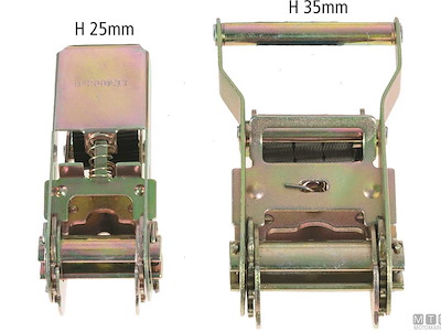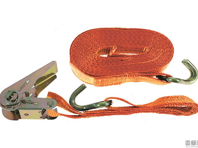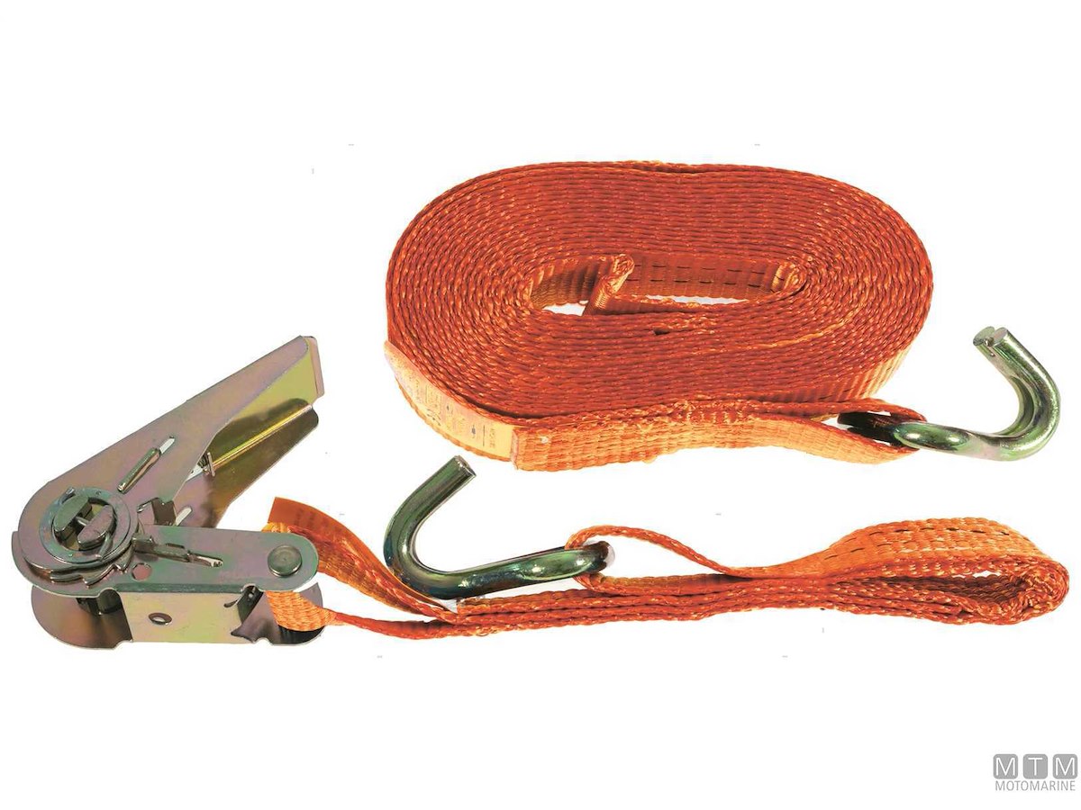 Cinghia tensionatrice con cricchetto e ganci in Acciaio Cadmiato e nastro in Poliestere ad alta tenacità. Ideale per il fissaggio di qualsiasi carico su imbarcazioni, ponti, stive, carrelli e automezzi. Certificata CE EN12195/2.