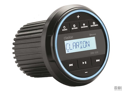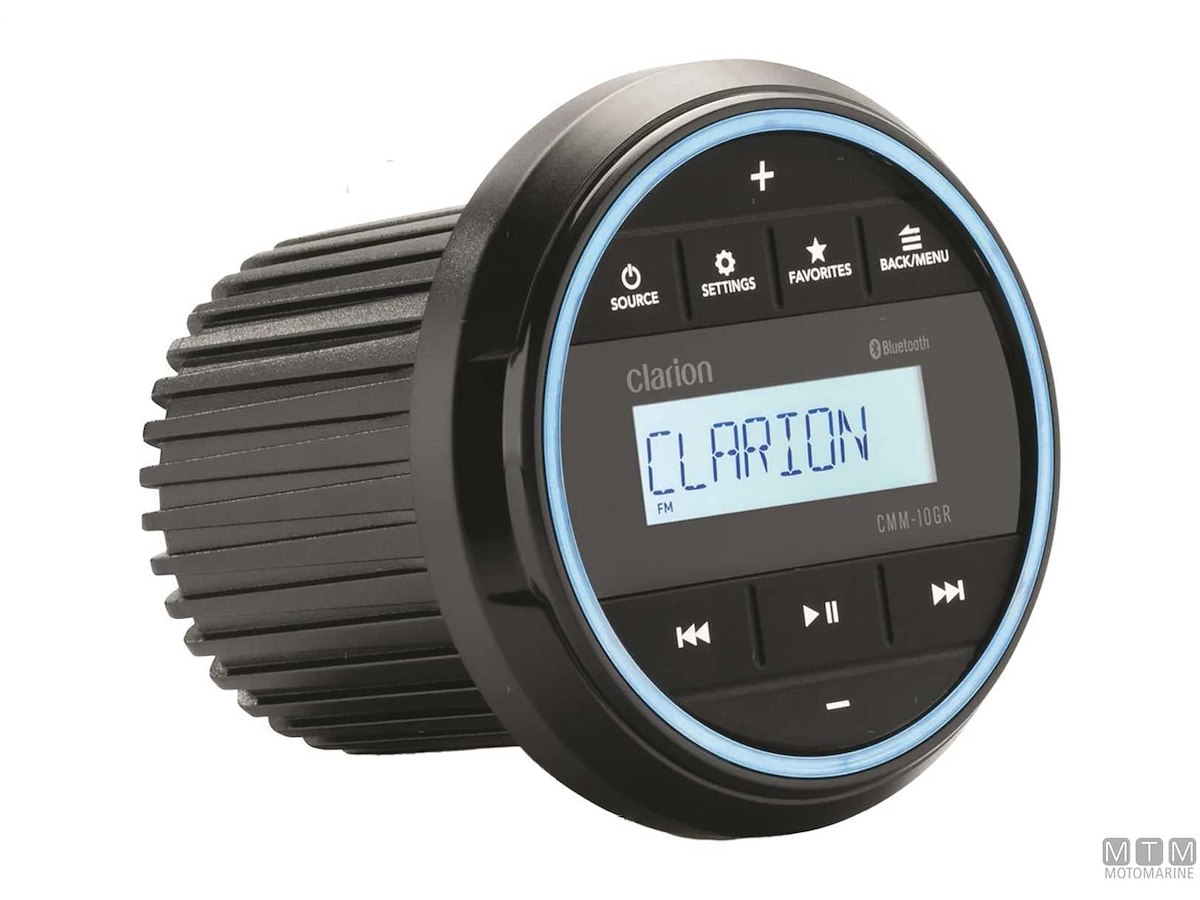 Radio lettore compatto Clarion CMM-10GR con display LCD e tasti retroilluminati. Radio AM/FM con RDS, porta USB e doppio ingresso AUX posteriori. Lettore MP3/WMA con Bluetooth integrato per audio streaming da smartphone. Montaggio a incasso con cassa impermeabile IP66, comprende cavi di collegamento, cornice e viti.