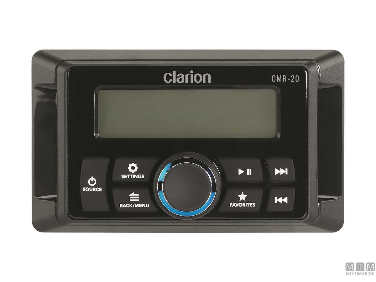 Comando remoto cablato Clarion CMR-20 con display LCD e tasti retroilluminati. Bluetooth integrato per audio streaming da smartphone. Cassa impermeabile IP67, comprende cavi di collegamento, cornice e viti. Compatibile con radio Clarion CMM-20/30/30BB.