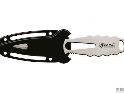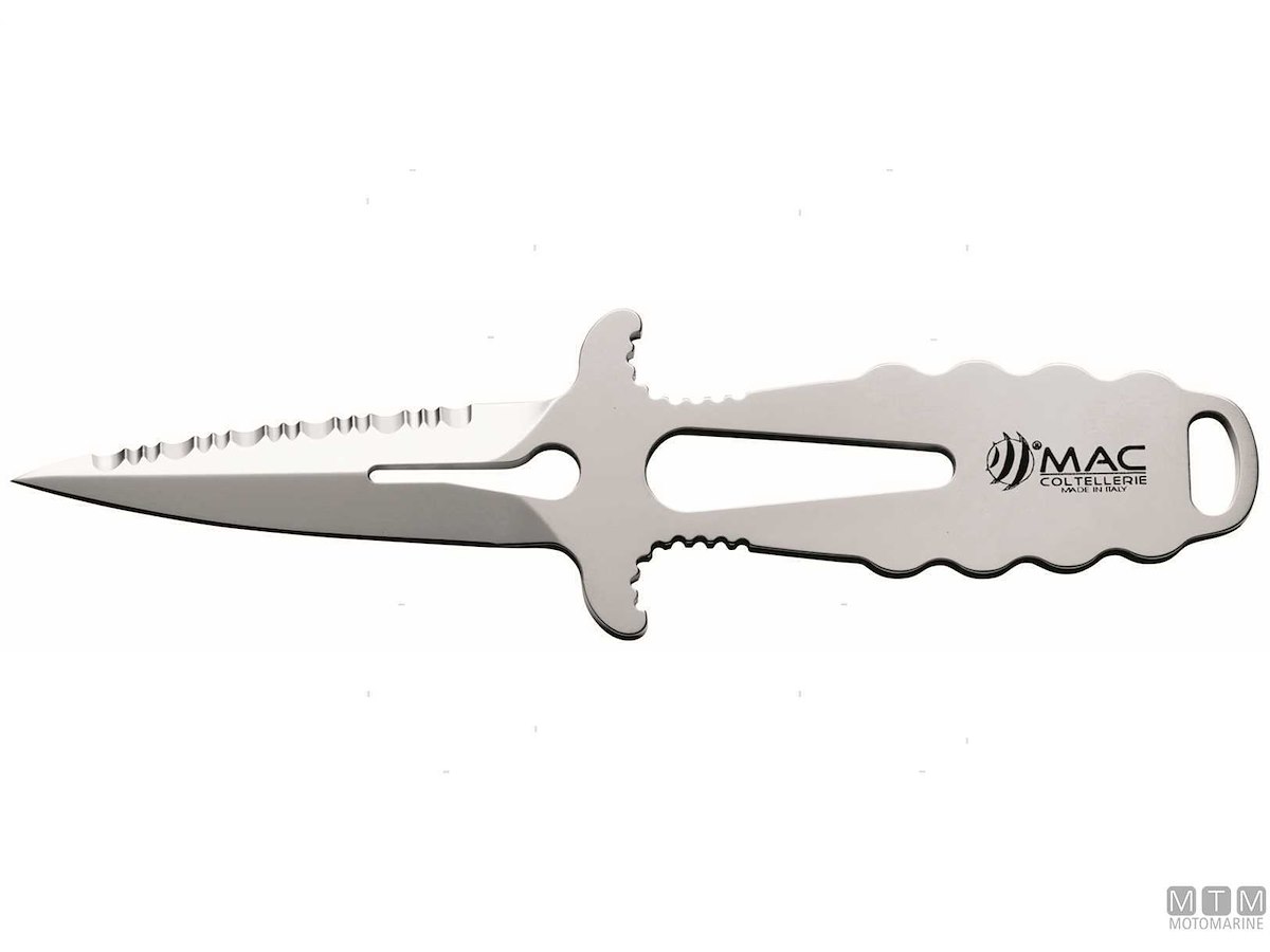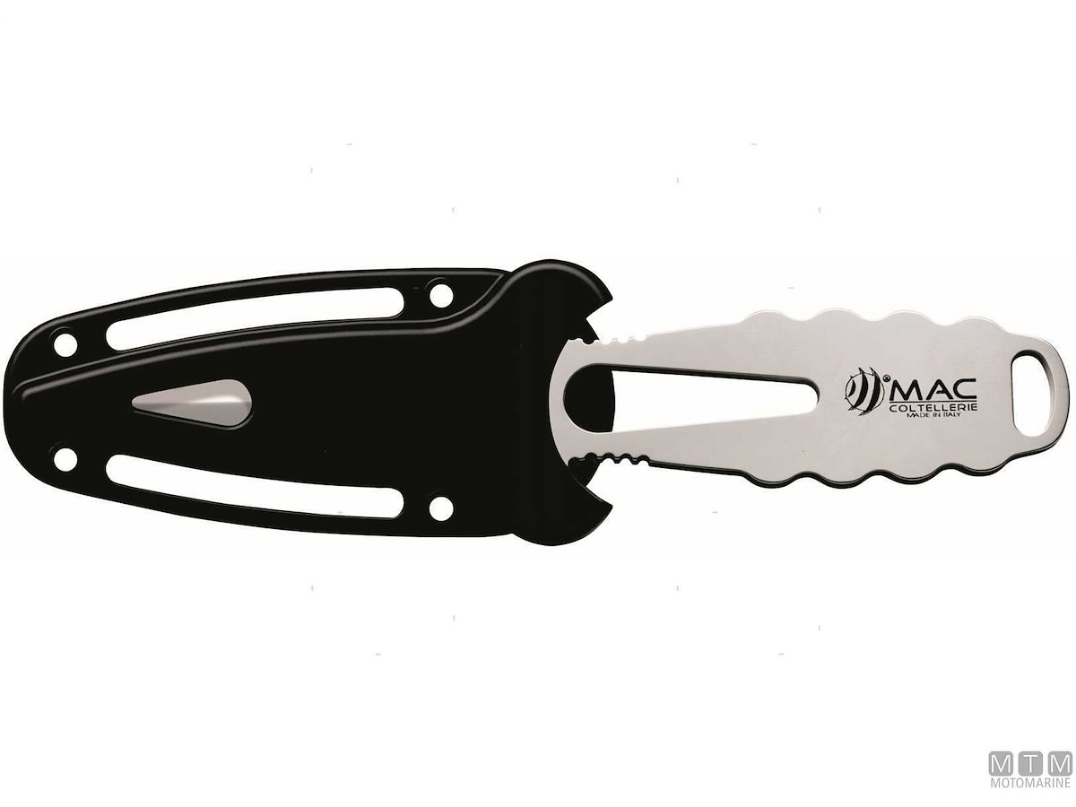 Coltello sub compatto con tagliacima e foro gira-grilli. Il manico in Acciaio Inox e lo spessore ridotto di soli 4 mm lo rendono un coltello perfetto per sub. Completo di fodero e cinghie. Lama in Acciaio Inossidabile W1.4116. Dopo l'uso sciacquare la lama con acqua dolce e ingrassarla.