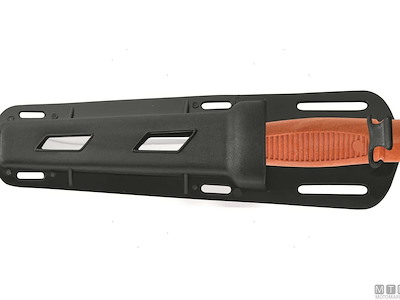 Coltello di sicurezza galleggiante con tagliacima, gira-grilli, fodero e cinghie. Manico in PP con espanso, lama in Acciaio Inossidabile W1.4028.