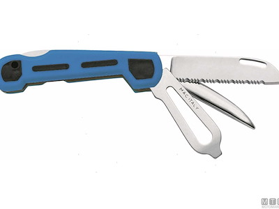 Coltello a serramanico con bloccalama. Completo di gira-grilli, apribottiglia, cacciavite a taglio e cavigliera aprinodi. Manico in PP e TPE, lama in Acciaio Inossidabile W1.4419.