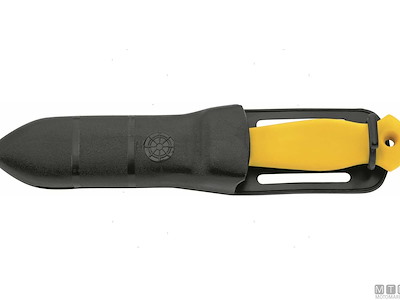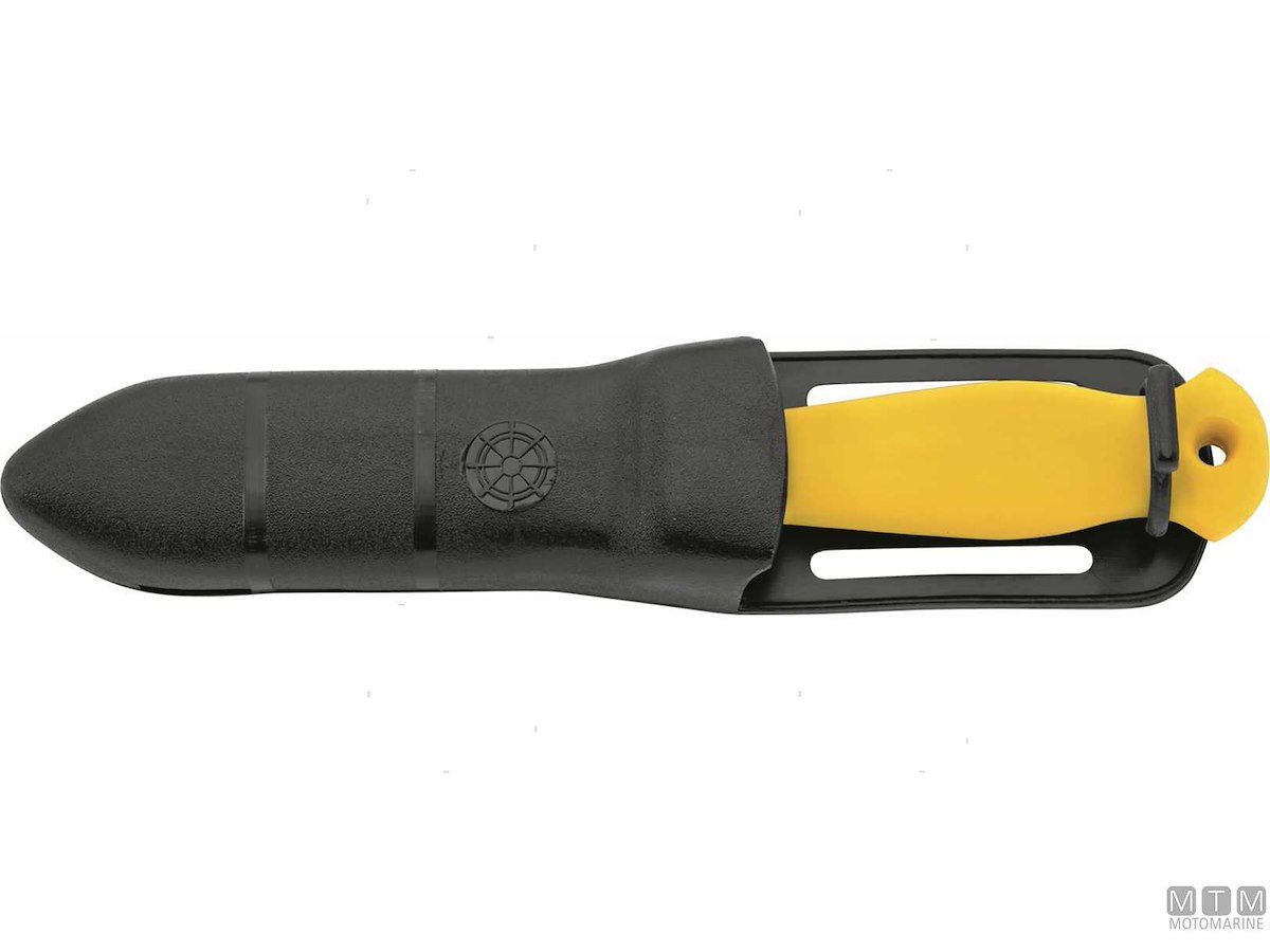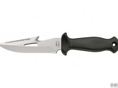 Coltello Sub con tagliaspago e giragrilli. Completo di fodero e cinghie. Lama in Acciaio Inossidabile W1.4116. Dopo l'uso sciacquare la lama con acqua dolce e ingrassarla.