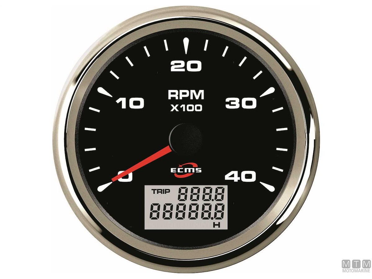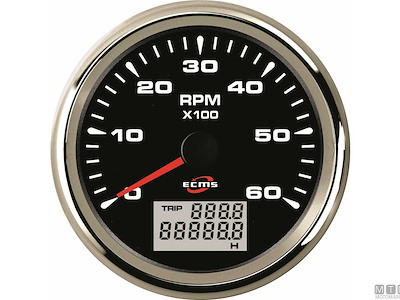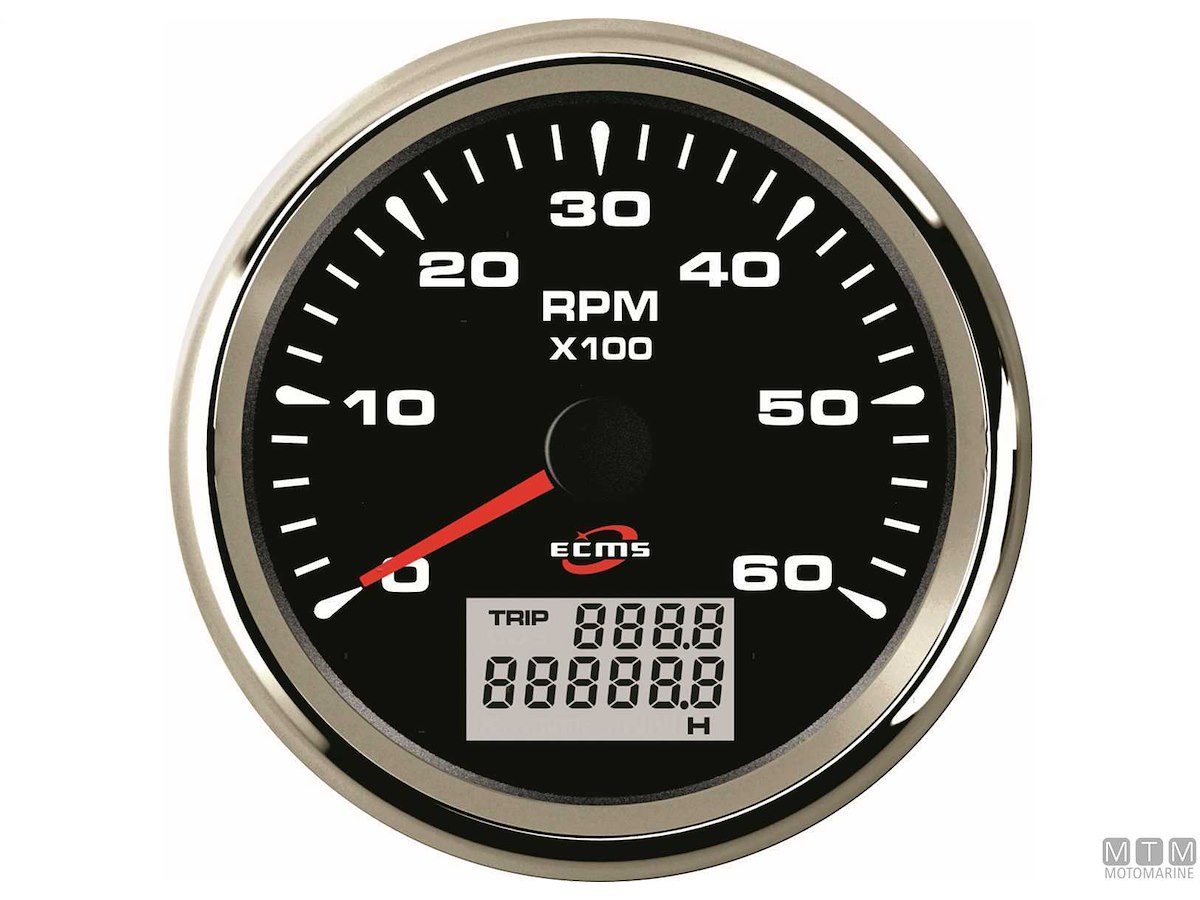 Contagiri/Contaore Ecms Black Chrome 12/24V completi di cavetti e attacco Molex. Cornice in Acciaio Inossidabile 316 con finitura cromata. Frontalino impermeabile IP67 con lente bombata anti-appannamento. Quadrante con retroilluminazione personalizzabile multicolore LED.