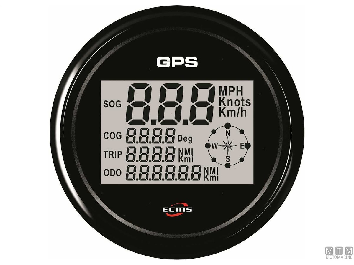 Contanodi digitale GPS Ecms All Black 12/24V completo di sensore GPS, cavetti e attacco Molex. Cornice in Acciaio Inossidabile 316 con finitura nera. Frontalino impermeabile IP67 con lente bombata anti-appannamento. Calcola la distanza percorsa dall'imbarcazione e permette di gestire le distanze delle singole tratte misurando la velocità in Nodi, MPH oppure Km/h. Quadrante con retroilluminazione personalizzabile multicolore LED.
